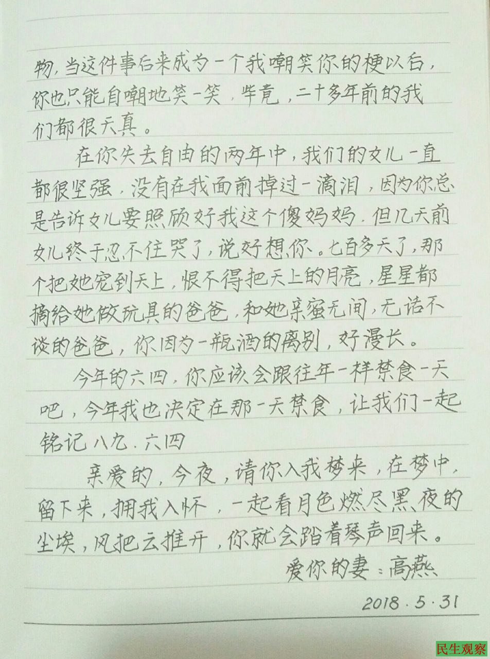 高燕给丈夫的信:今年六四,我跟你一起禁食 |