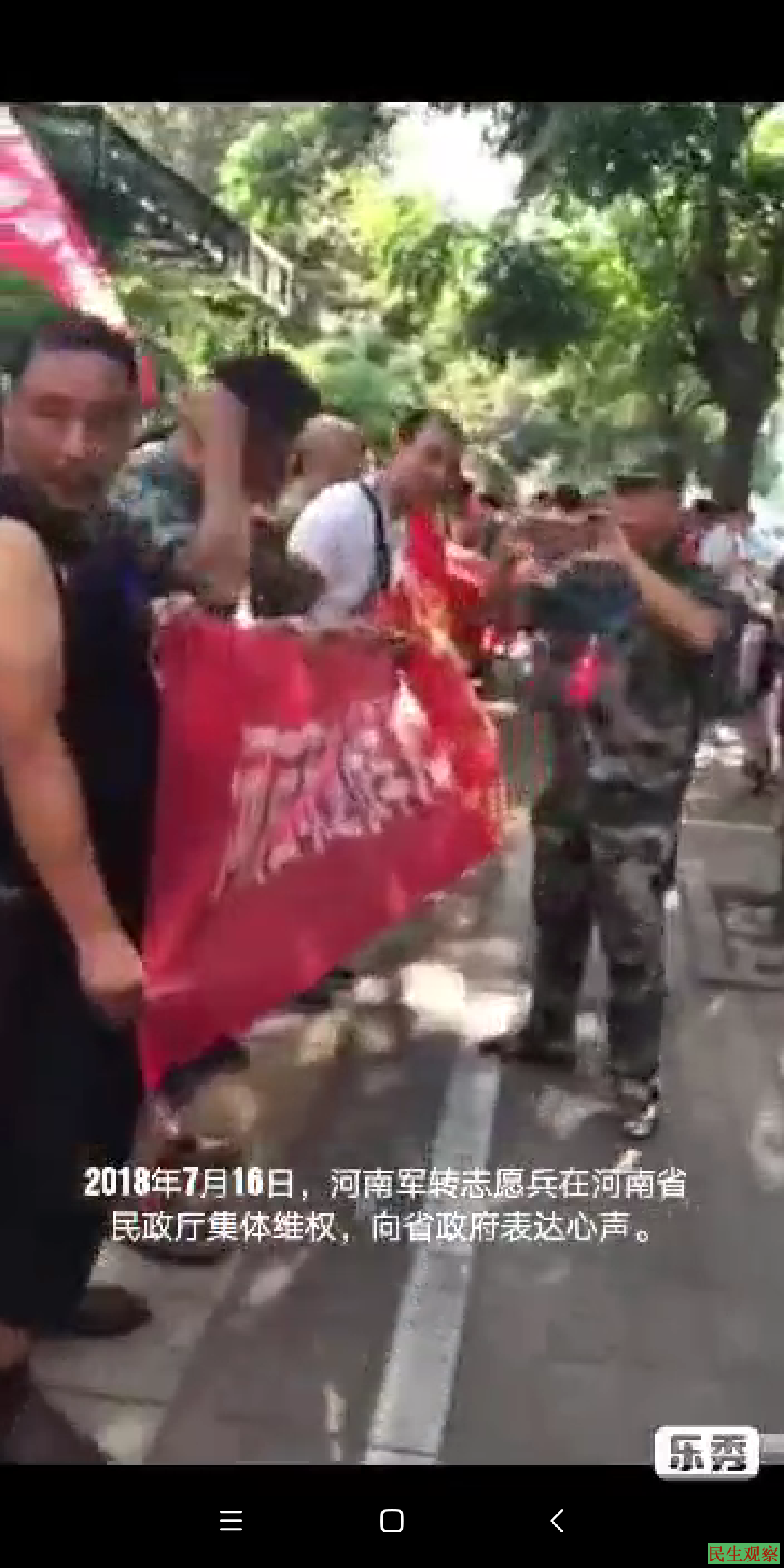 7月16日,河南军转志愿兵在河南省民政厅门口集体维权,向省政府表达心声。从现场视频我们看到,维权的队伍一眼望不到头,估计有2千人左右,全体战友们头顶烈日,不辞辛苦,从四面八方赶到省会郑州,为的是找回自己的尊严,讨回公道,让全社会都明白---军人是最受尊崇的职业!据现场老兵透露,在现场马路边上到处都是各个地方的截访人员,他们一直在等待机会将上访老兵偷偷截回当地控制,这样既可以向领导交差又可以得到酬劳。