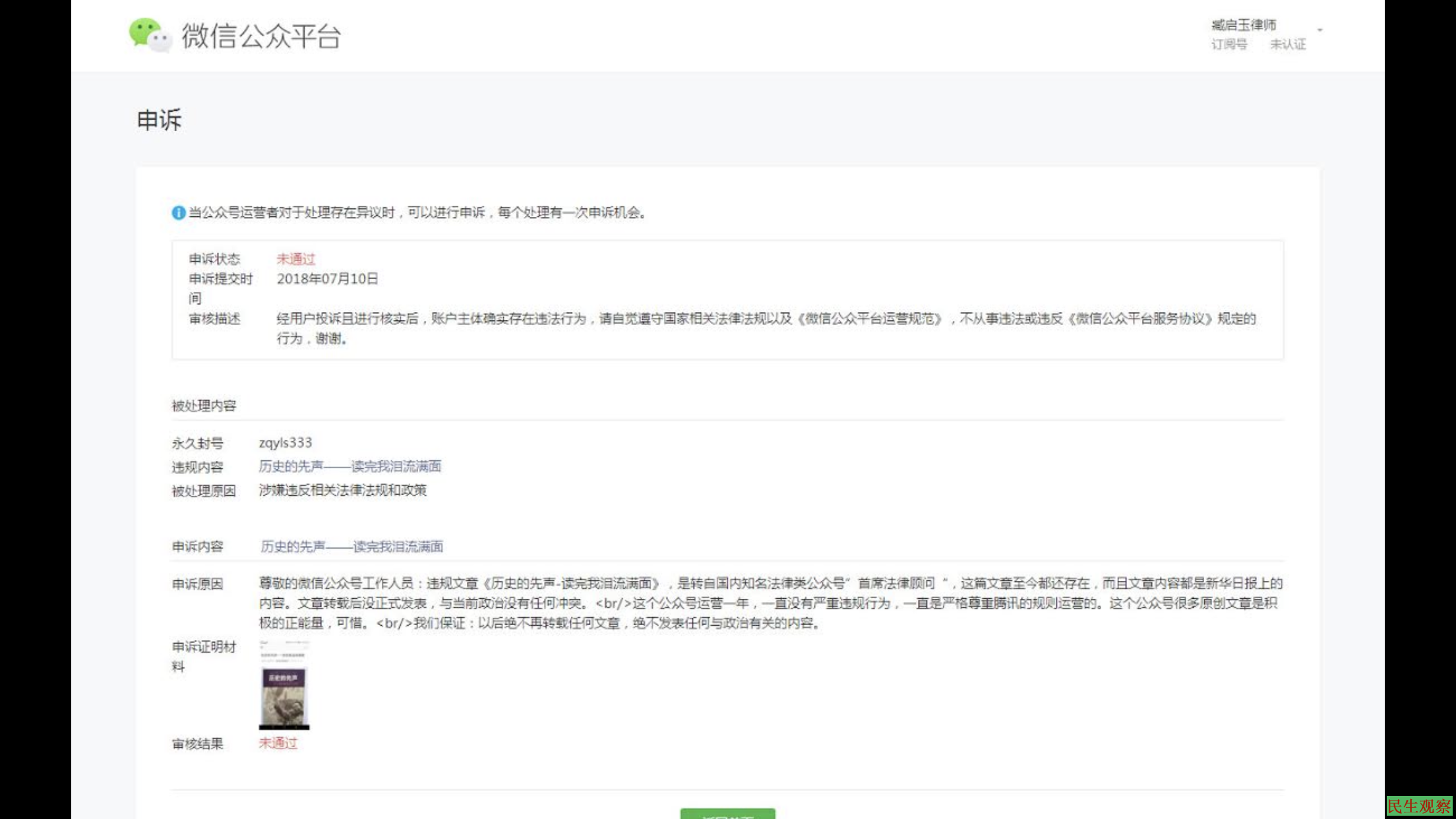 【民生观察2019年6月13日消息】2018年7月10日,腾讯公司以无中生有的理由将“臧启玉律师”公众号(zqyls333)永久封禁。