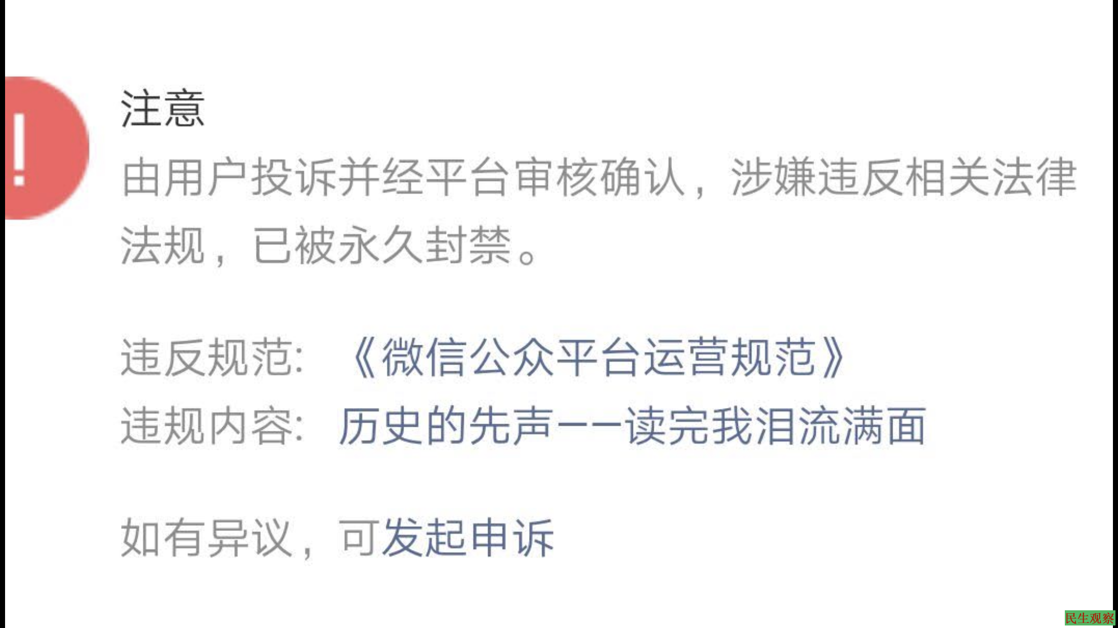 3、文章《历史的先声—读完我泪流满面》没有正式发表,怎么会有用户投诉?永远封禁的理由为莫须有。