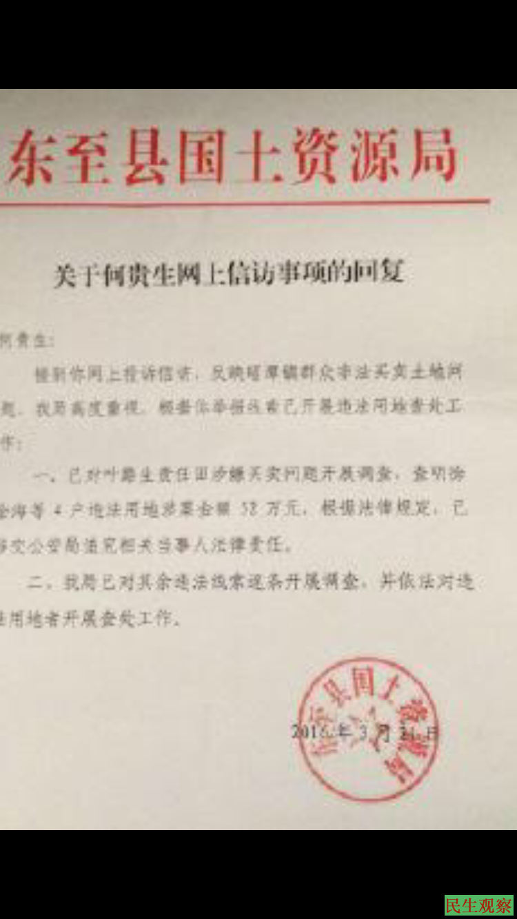 举报一:东至县纪委方建新书记答应:会督促县级监察委调取2019年元月10日昭潭镇纪委唐国培反馈中央第十一巡视组答复函中重点提到 “县国土局、检察院等职能部门原已查证村支书徐慧明倒卖杨记明、李长根等户1.91亩土地(实际系五保户承包耕地)等涉恶直接证据”!特恳请安徽省扫黑除恶办、省监察委领导您能依法予以督导查处。