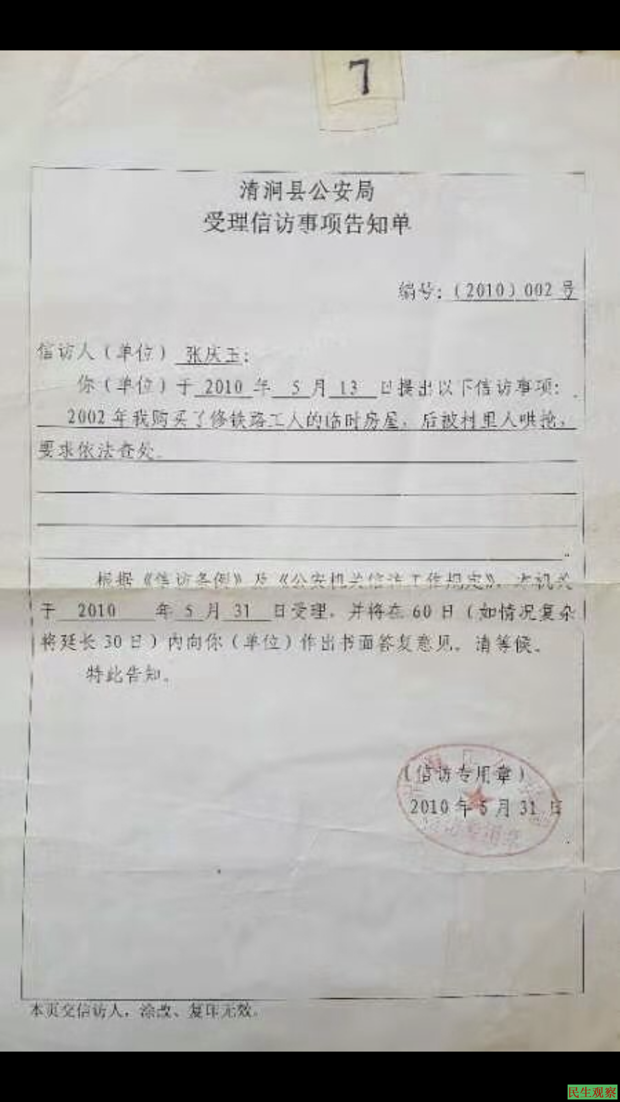 张庆玉向石咀驿派出所报案,并出具了中铁隧道集团的售房屋协议等证据,但是,派出所和村委会(实为村长、村支书)辩称,张庆玉出具的证据不能证明简易房是中铁隧道公司卖给了张庆玉,张庆玉有伪造证据的嫌疑。
