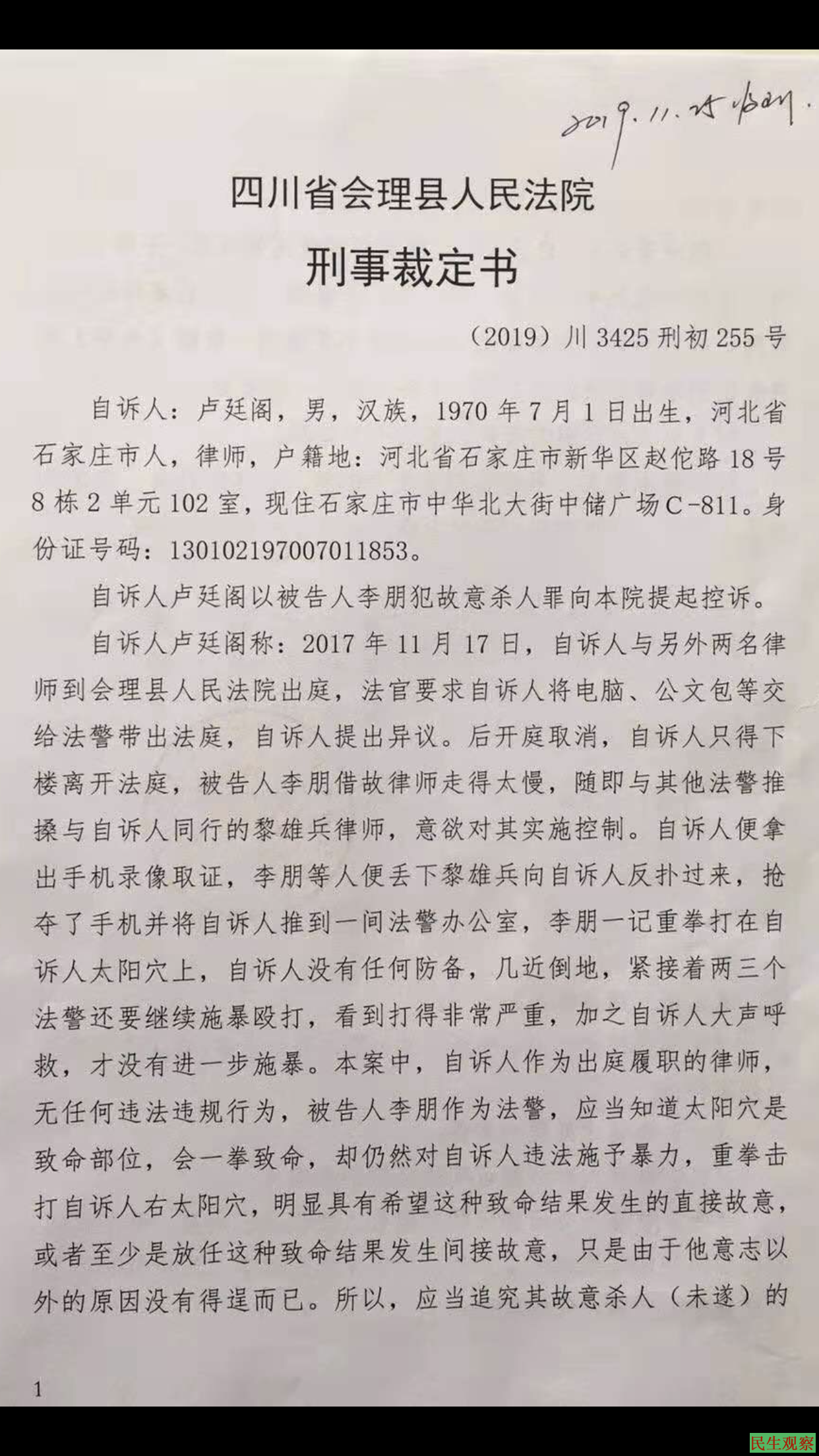 【民生观察2019年11月29日消息】河北律师卢廷阁2017年在代理一起法轮功学员案件时,被会理法院法警李朋殴打致昏迷,但他维权2年都没有结果。2019年11月27日,卢廷阁提起刑事自诉,以故意杀人未遂罪起诉李朋,要求法院追究打人者刑事责任,并依法向四川省凉山州中级人民法院提起上诉。