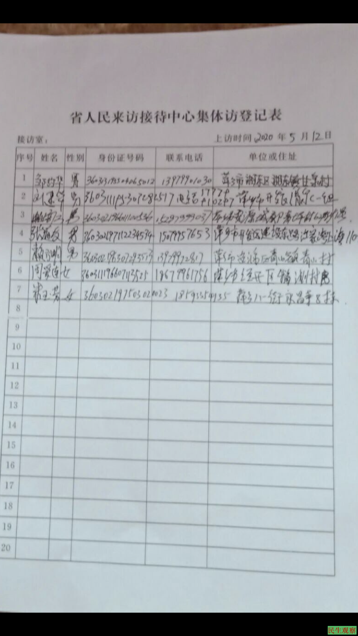 【民生观察2020年5月14日消息】日前,江西萍乡维权访民朱玉芳、周爱莲等七人集体到省会南昌信访维权,不过遭到信访官员的推诿卸责,最终以疫情期间不受理为由拒绝接访,并将集体信访登记为个人信访。