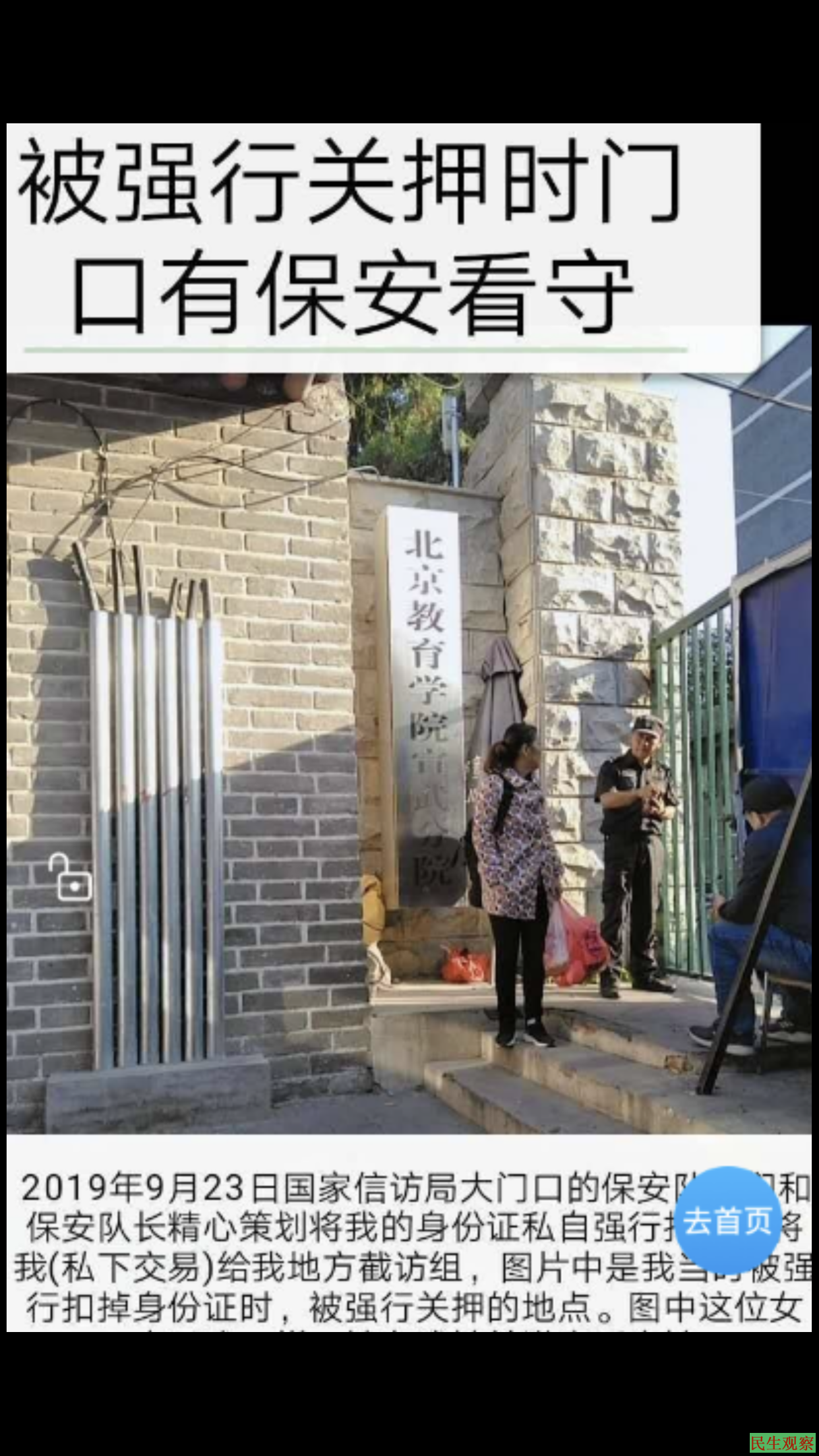 同年9月23日我在国家信访局门口,又被一批有组织的截访队强行绑架后送至滨海县公安局,折磨到24日晚,将我再次强行投送进盐城市看守所,限制人身自由至10月1日晚放出,期间镇政府找人给我做了取保候审(我并不知情),至今公安局不给我拘留决定文书,盐城市看守所拒绝给我释放证。