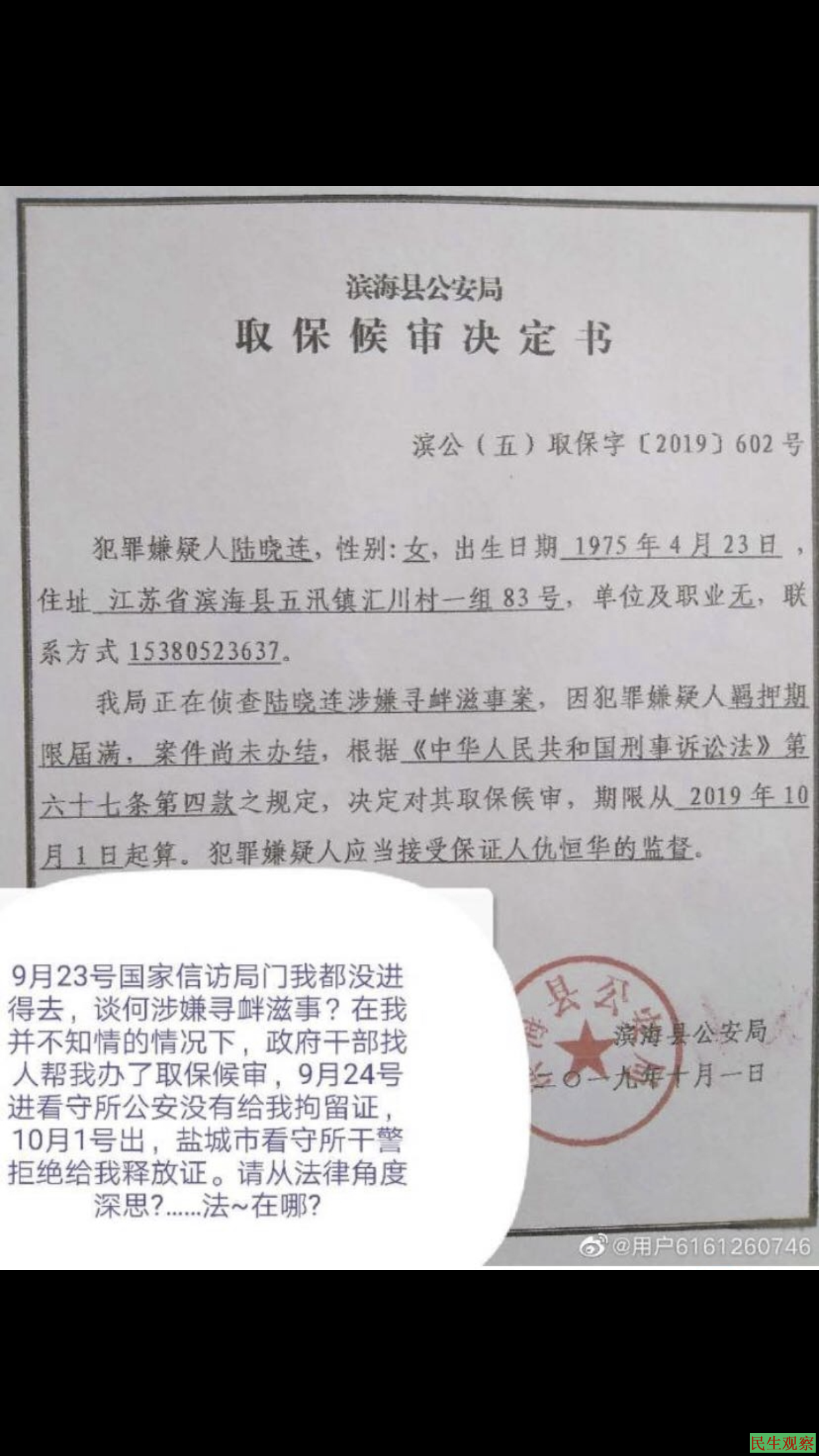 【民生观察2020年5月21日消息】江苏省滨海县访民陆晓连,因土地被镇干部霸占而逐级上访,问题至今得不到解决,无奈之下到国家信访局继续维权,多次遭地方人员绑架,带回当地后被以莫须有罪名拘留。