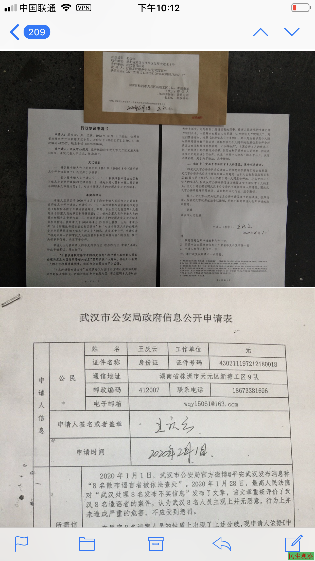 【民生观察2020年6月3日消息】6月1日中午,湖南公民王庆云将一份对武汉市公安局的行政复议书寄往武汉市司法局的行政复议服务中心(见附件1),寄出去后,王庆云把复议书和邮寄单等拍照发在其推特上(见附件4)。