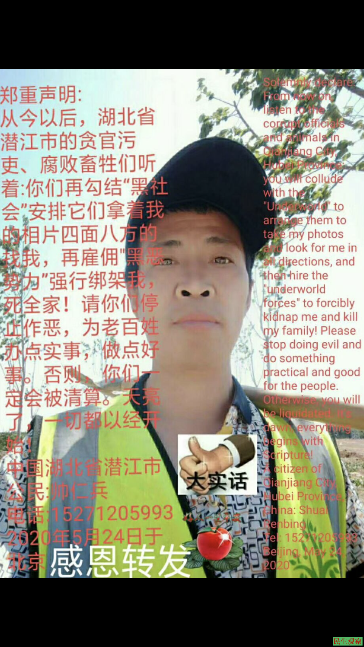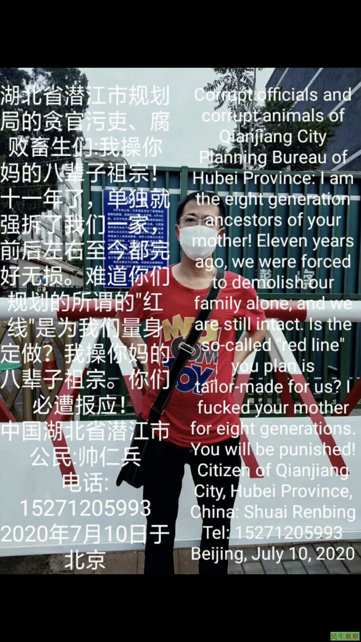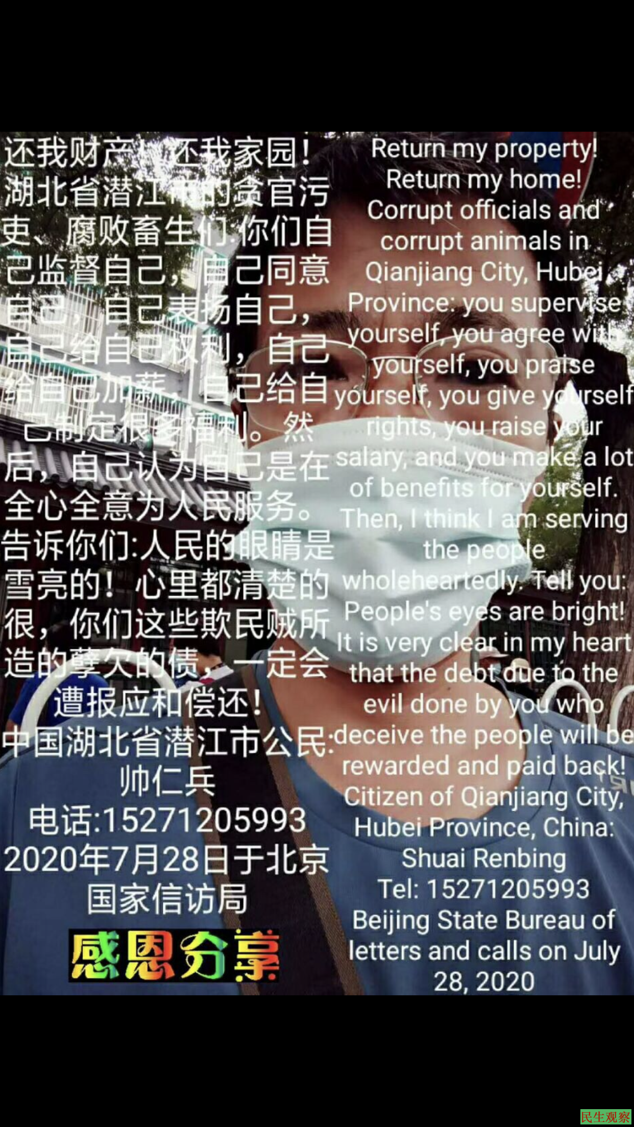 帅仁兵因房屋被强拆维权被判刑三年,2018年8月19日出狱后一直在申诉,先后到湖北省信访局,湖北省高法,湖北省公安厅投诉,申诉无果后就到北京申诉,到北京后基本没有回潜江,在北京重大会议与节日期间被潜江乡政府部门绑架回潜江外,几乎都是在北京没有回潜江,长期在北京维权申诉,夫妻俩都被判刑后基本改变了一家人的生活方式,夫妻俩长期分居两地,家里由老婆梁志英照顾,他就在北京租房维权,帅仁兵也算是“北漂”人员了。