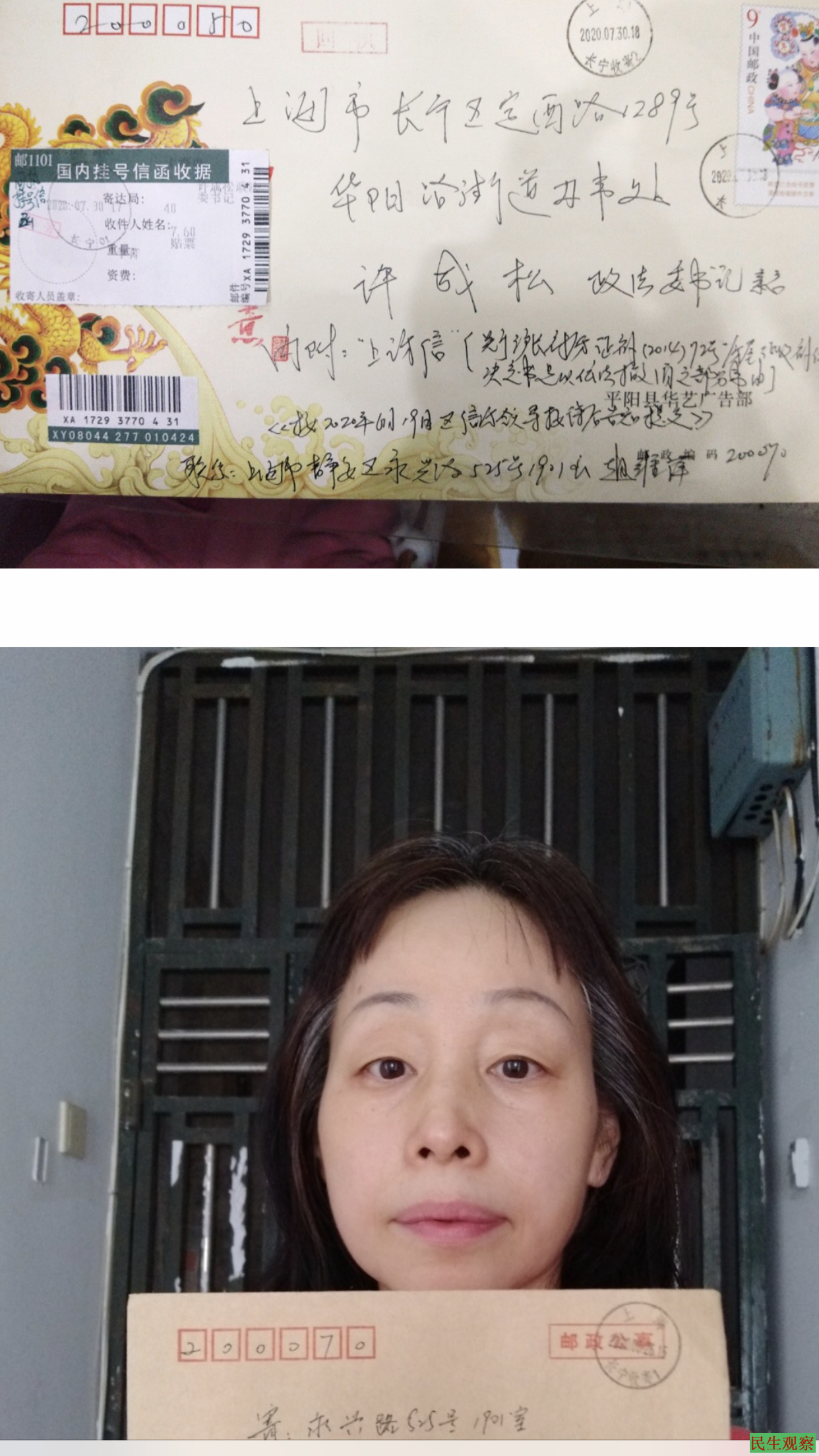 【民生观察2020年9月4日消息】2020年9月2日,上海市长宁区访民赵维萍来电反映,她于今年7月30日到上海长宁邮政支局,以回执挂号邮寄给上海长宁区华阳街道政法委书记的“上访信”,遭故意篡名“赵组萍”且不容更正、查询笔迹,非赵维萍本人填写的内容均被邮政系统归档。赵维萍怀疑,她再度遭“他人”冒名取代甚至谋财害命。