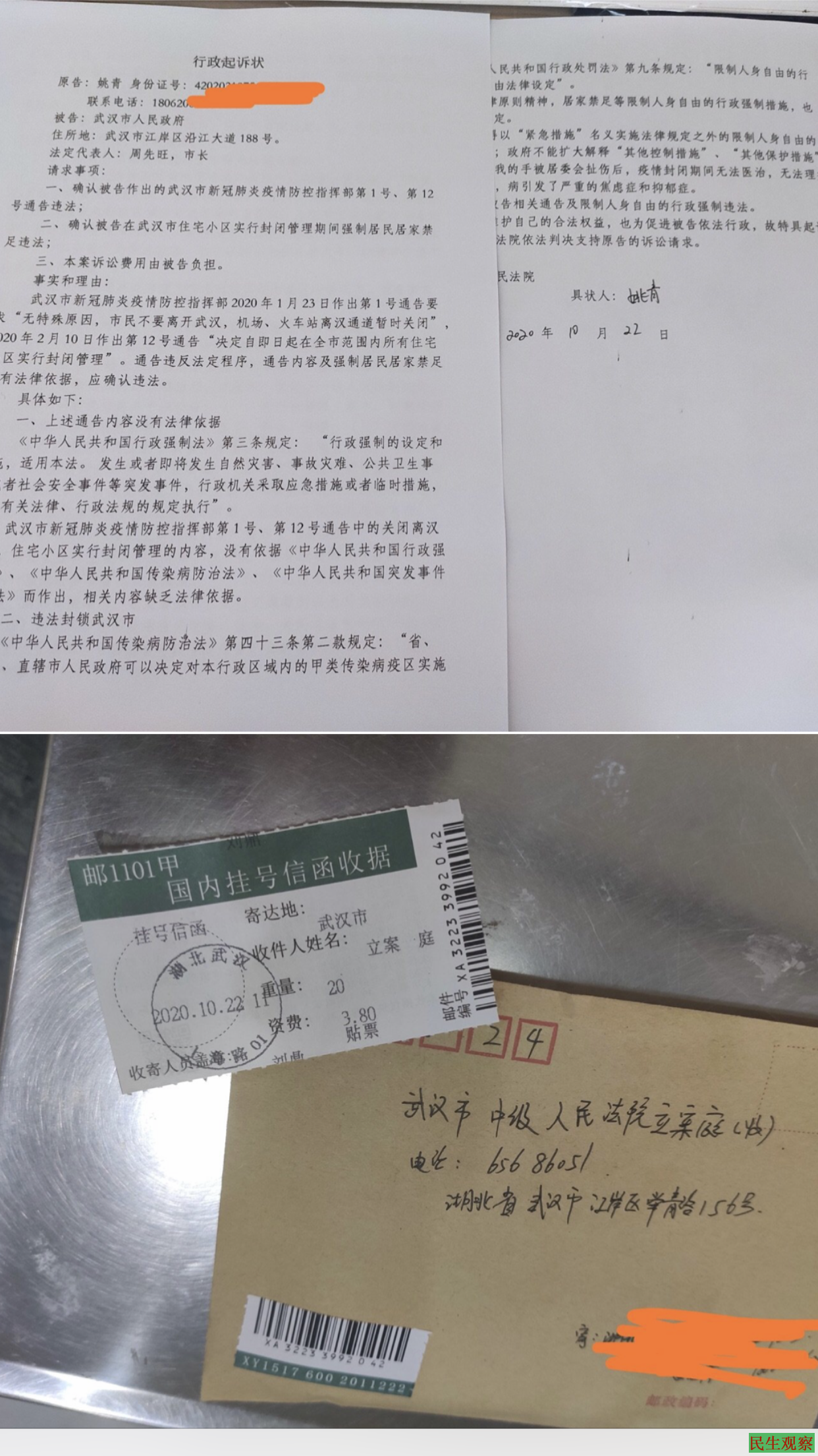 【民生观察2020年10月23日消息】10月22日上午近11点,武汉访民姚青将2份行政起诉状通过邮政挂号信方式寄往武汉市中级人民法院。