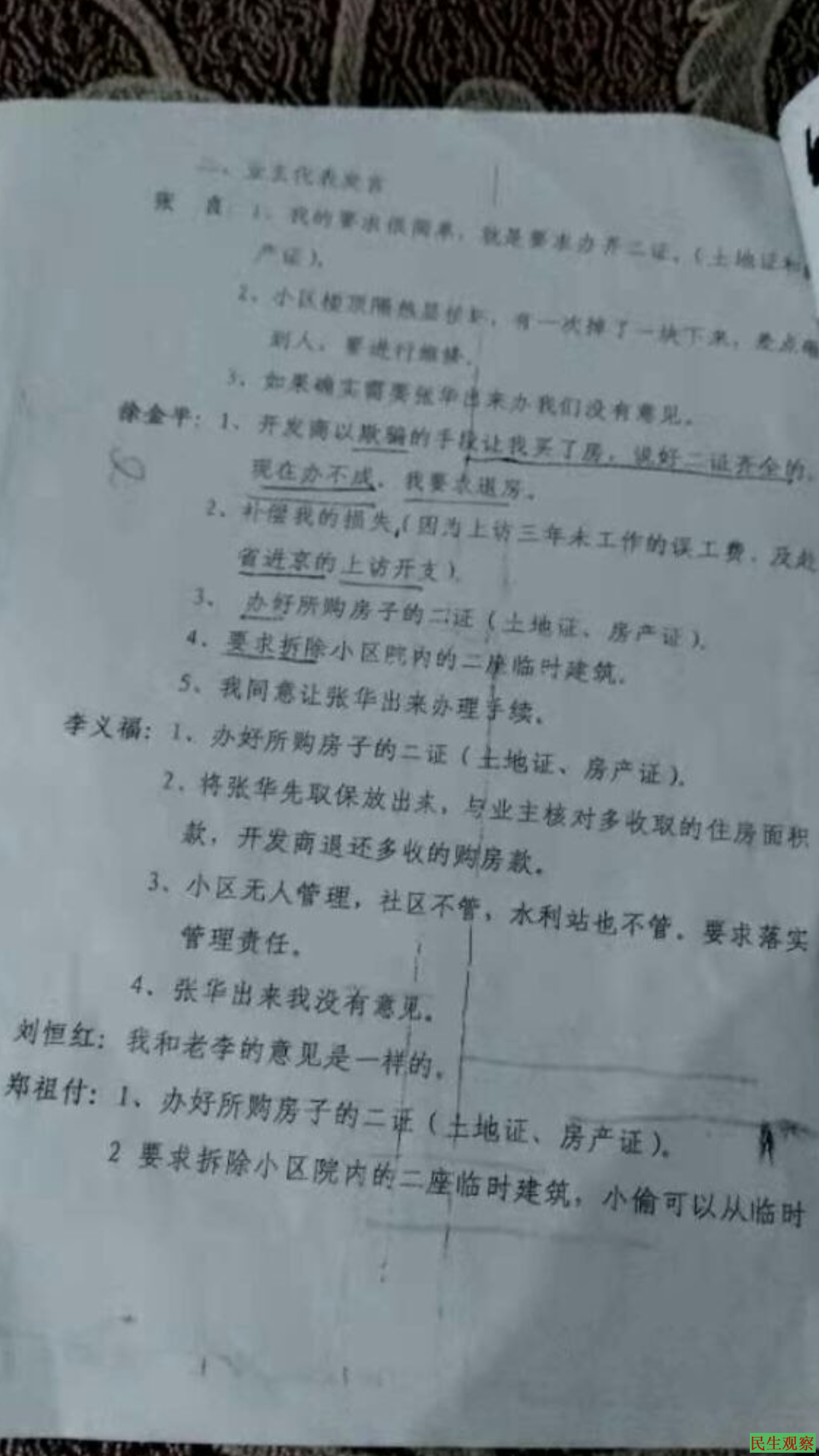 由于张华,张红萍分别在2016年12月13日与7日分别被抓捕,两人伪造公章证件涉案被抓捕,这一案件必定牵涉很多人,在2017年1月24日由公安局治安支队队长李圣方通知徐金平与其他7位业主代表去支队写谅解书,开会说你们写谅解书把张华放出给你们解决问题,在设局召开业主会议中没有谁写谅解书,只是在会议记录上签字,参加会议的7位代表大都意思是要张华办理房子土地证与房产证,并配合相关单位给买房业主退回多收的房款,