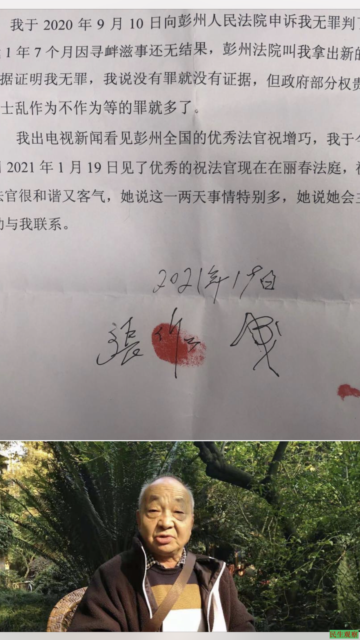 2017年7月,张作成第十几次去北京上访喊冤,回来后就被彭州市公安局关押。随后由彭州法院以“寻衅滋事罪”判处有期徒刑一年七个月,而且还是没有公开审判的内部结果。刑满释放后依然行走在抗争维权的道路上。去彭州法院阅卷不被允许,递交材料没人接收,再审申诉不予受理,催促答复没人理睬,约见法官没人回应。再一次把张作成逼到了没有希望的晦涩境地。