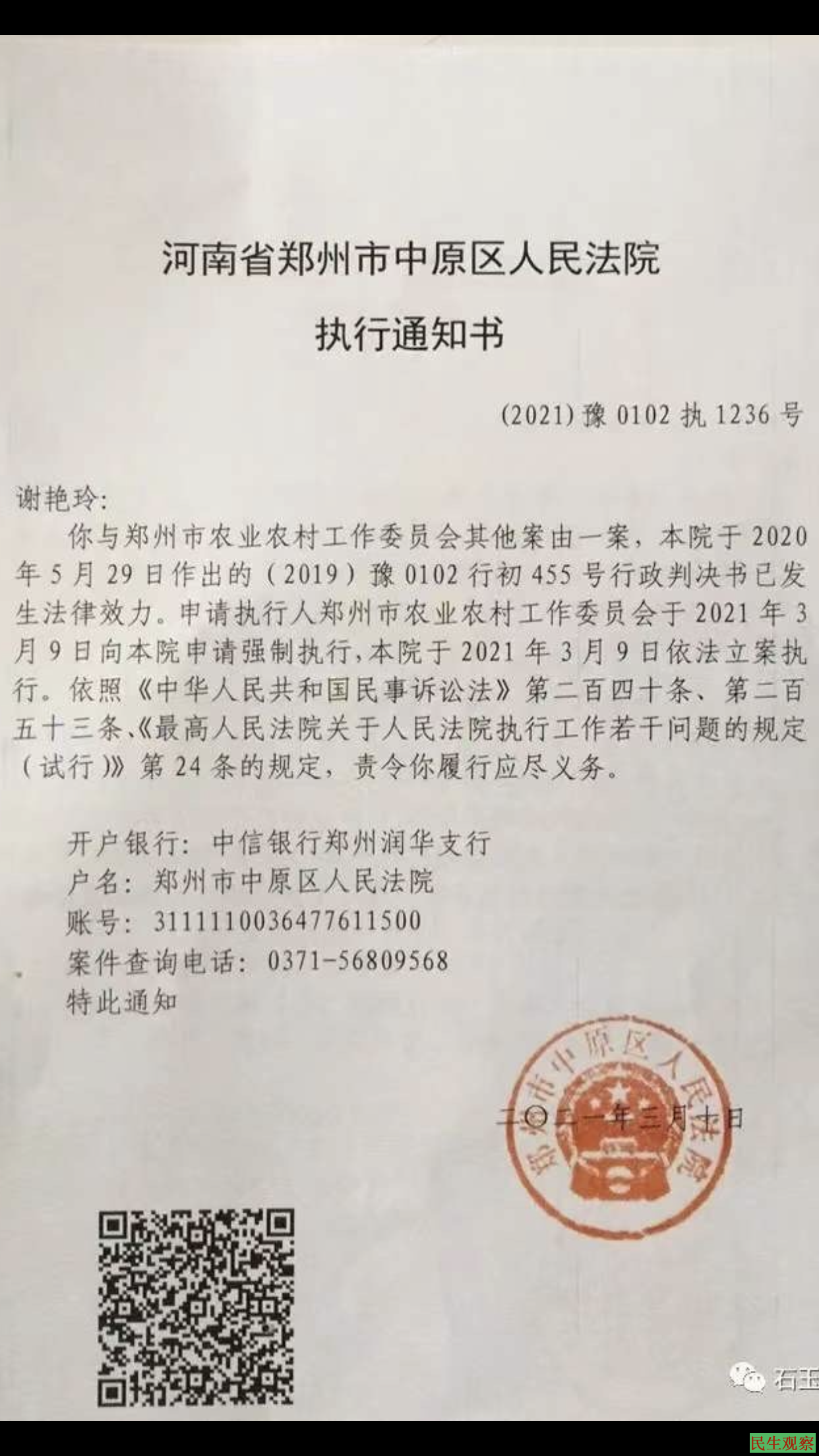 2020年9月,郑州市中级人民法院终审维持该处罚。谢艳玲认为案件证据认定存在重大问题,拟提起再审。但还没等她提起再审,2021年3月9日,中原区农业农村工作委员会向中原区人民法院申请强制执行拆除她的房屋。