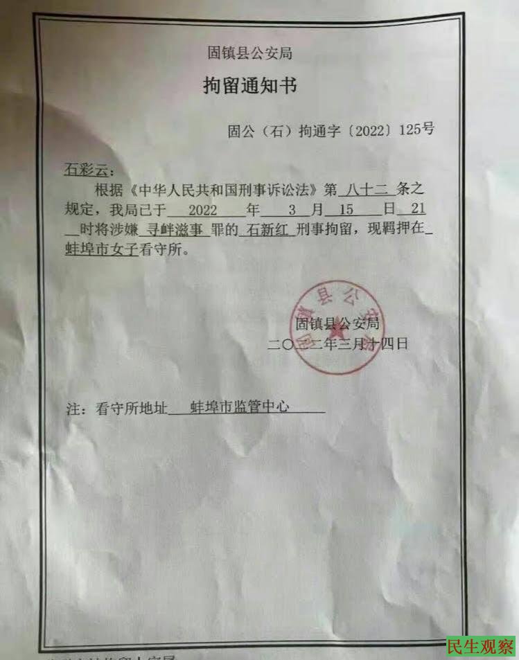 石新红在3月14日被当局非法从北京非法抓回当地后,3月15日被非法构陷寻衅滋事关押在当地蚌埠市女子看守所,这是当局蚌埠市公安局出具的法律文书依据,随后当局在此出局延期关押法律手续为,关押时间为改于2022年3月18日至2022年4月14日。两份法律手续相隔三天时间后改为延期拘押在蚌埠市女子看守所。