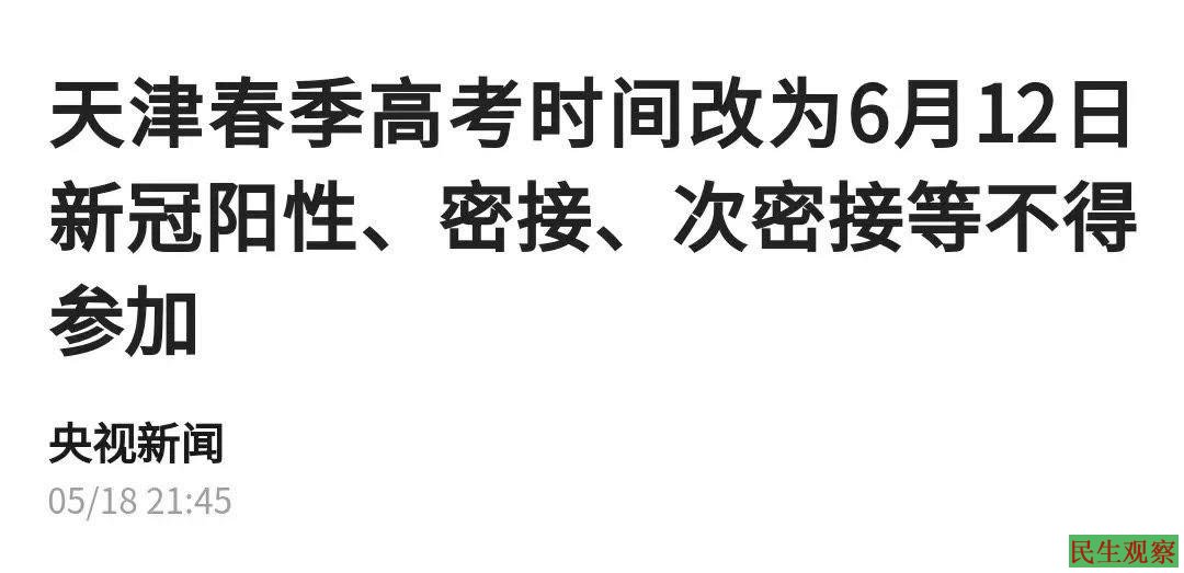 5月18日,央视新闻发布了天津高考新政:天津春季高考时间改为6月12日,新冠阳性、密接、次密接等不得参加。