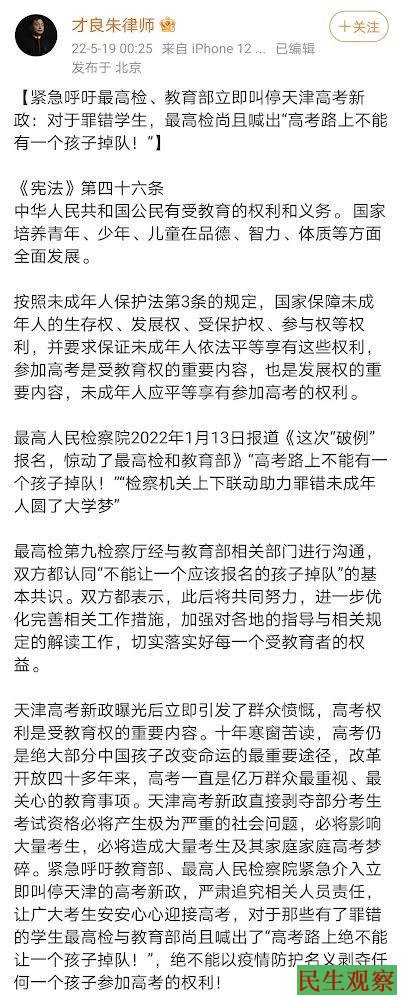 【民生观察2022年5月19日消息】2022年5月18日央视新闻发布:“天津春季高考时间改为6月12日,新冠阳性、密接、次密接等不得参加”。该消息一出,立即引发了群众愤慨。5月19日,朱孝顶律师紧急发文,呼吁最高检、教育部立即叫停天津高考新政:对于罪错学生,最高检尚且喊出“高考路上不能有一个孩子掉队!”绝不能以疫情防护名义剥夺任何一个孩子参加高考的权利!