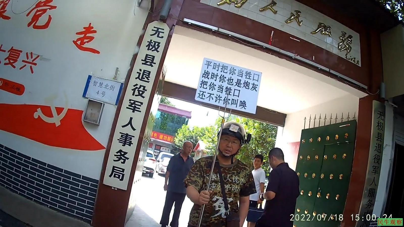 2022年7月18日,王永红去了无极县退役军人服务中心举牌,上面书写:“平时把你当牲口,战时你也是炮灰,把你当牲口还不许你叫唤”;