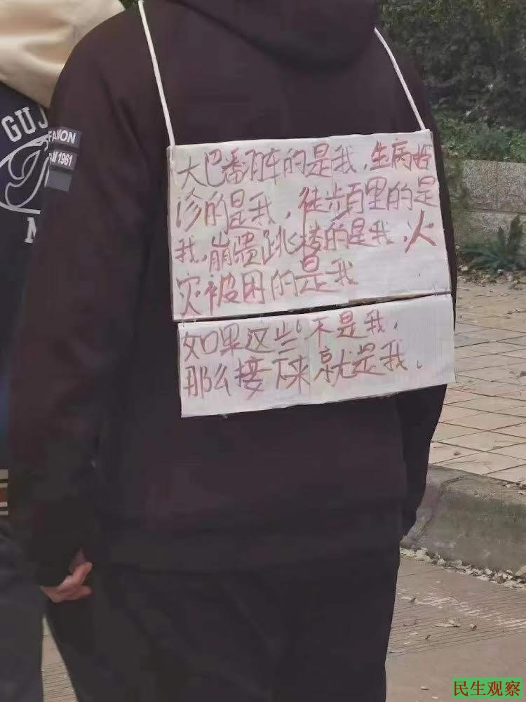 11月26日,西北政法大学核酸现场,一名同学背后挂着“大巴车翻车的是我,生病拒诊的是我,徒步百里的是我,崩溃跳楼的是我,火灾被困的是我。如果这些不是我,那么接下来就是我。”字样的纸板。随后,刚走到检测台,被学工部带走,被严重警告处分6个月。