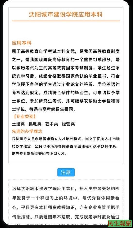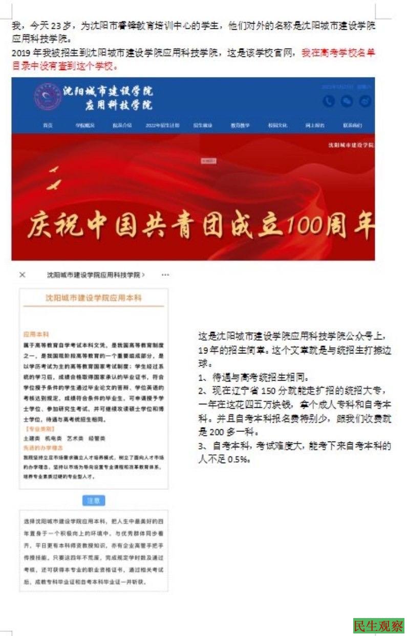 【民生观察2023年3月29日消息】沈阳城市建设学院应用科技学院存在夸大宣传虚假招生问题。据悉,当初招生时宣传是全日制的大专学历,然而实际上是全日制教学的成人学籍。导致现在学生四年学习之后学信网没有学籍,交了四年的学费,什么学历都没有。学生们前往当地教育部门投诉,但是没有得到任何回应。在抖音上发消息,被威胁删除。