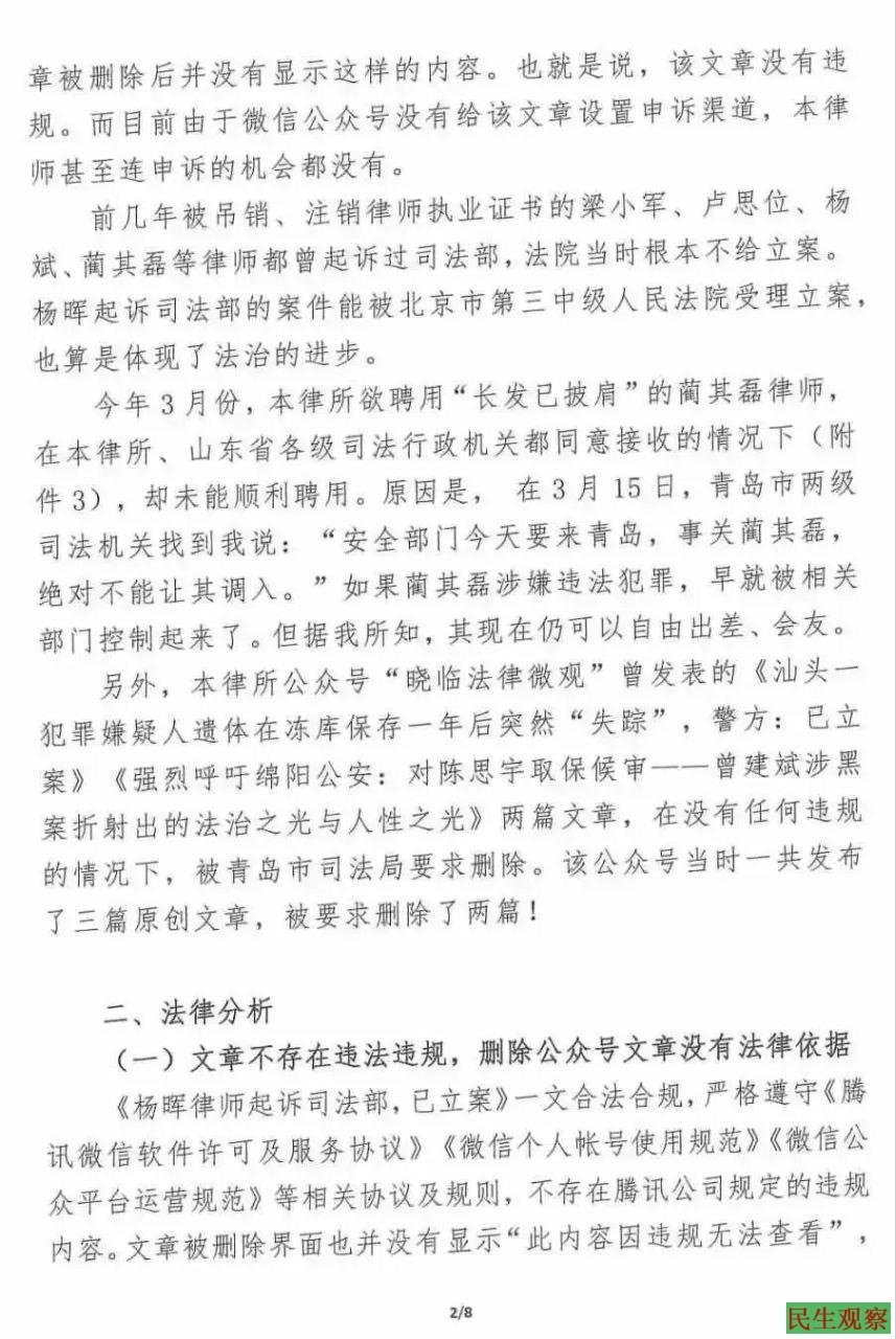 于律认为,该文章不存在违法违规,删除公众号文章没有法律依据;青岛市司法局、青岛市律师协会强制删除文章,侵犯了他的言论自由。