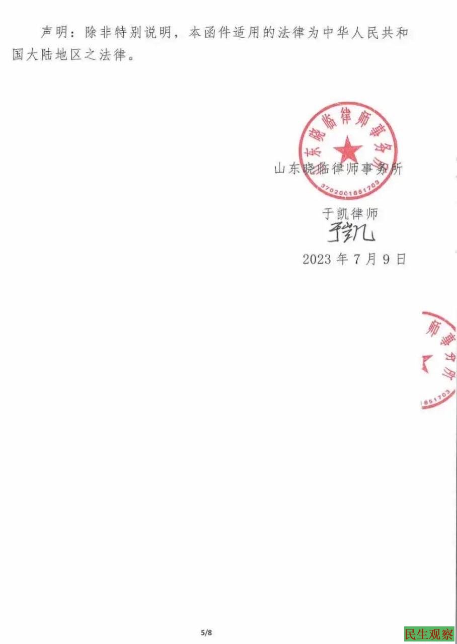 【民生观察2023年7月11日消息】2023年7月9日,山东青岛的于凯律师,因文章被青岛司法局和律协联合腾讯公司删掉,现发律师函给司法局和律协,要求恢复该公众号文章,保障自己的言论自由。