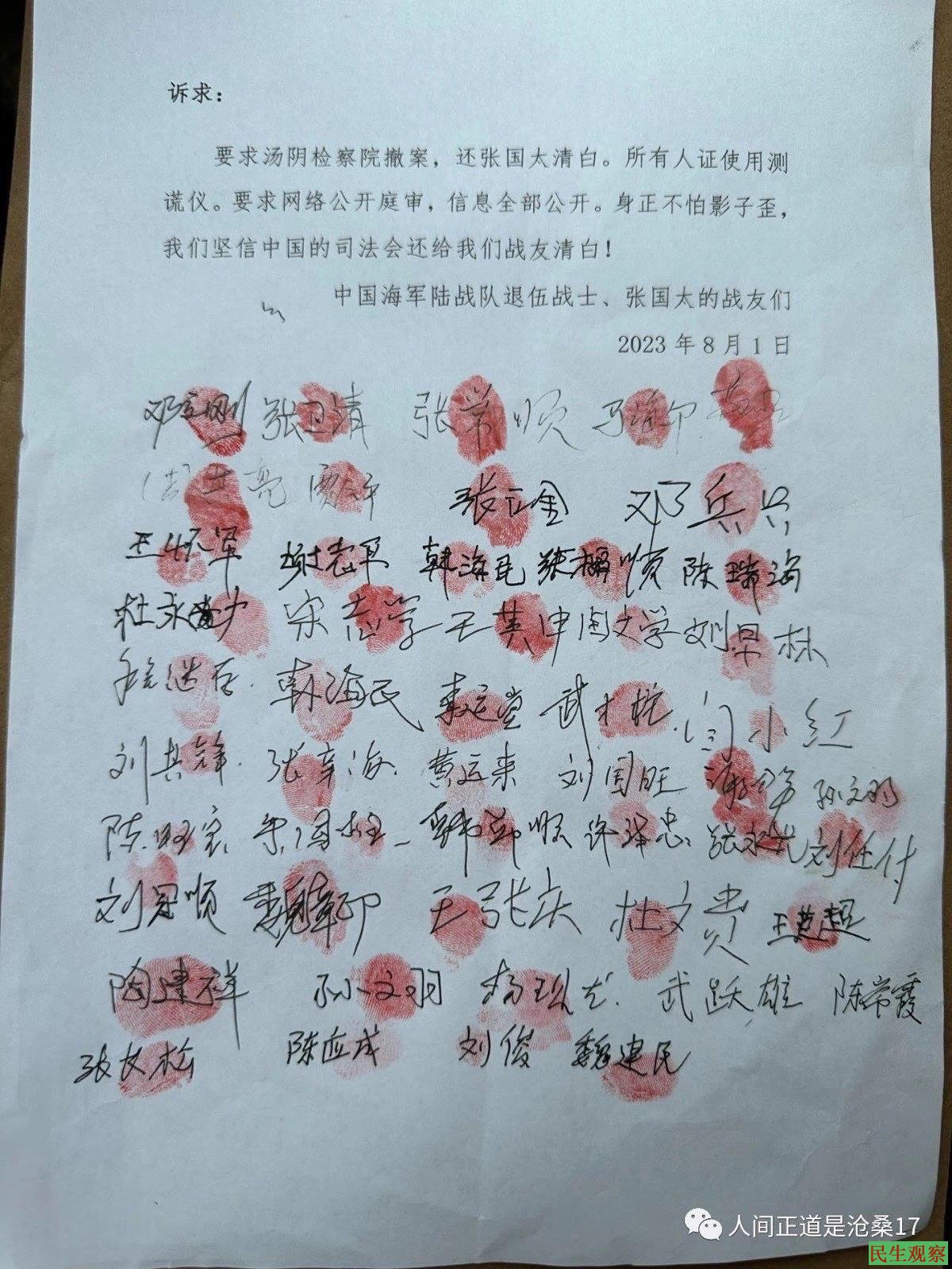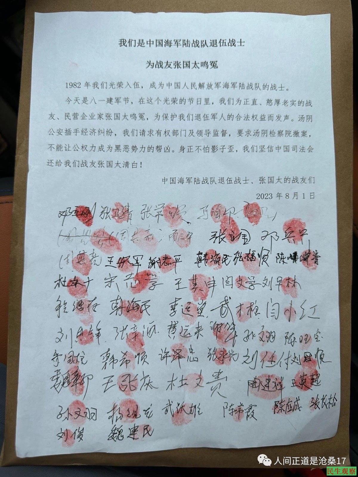 【民生观察2023年8月3日消息】2023年8月1日建军节,一批从中国人民解放军海军陆战队退伍的老兵为一个战友张国太鸣冤。老兵们集体签名按下手印,请求有关部门及领导监督,要求汤阴检察院撤案,还张国太清白。