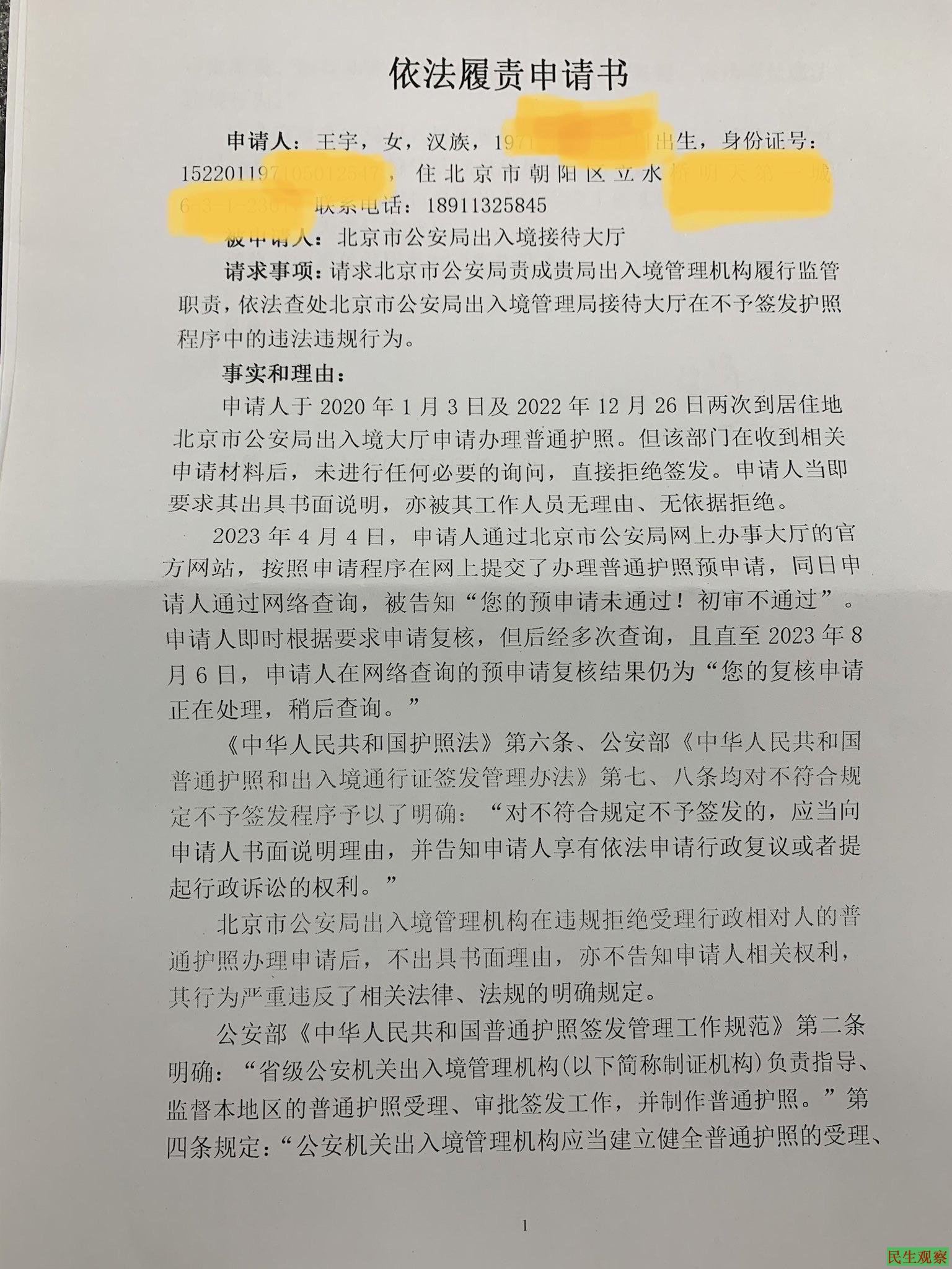 【民生观察2023年8月8日消息】因北京市公安局出入境管理部门及内蒙古自治区兴安盟和乌兰浩特市出入境管理部门,拒绝给王宇办理普通护照,针对此违法行为,王宇向北京市公安局和内蒙古自治区公安厅提起依法履责申请书,并于8月7日邮寄至有管辖权的机关,目前等待法治国家对其依法查处并纠正其违法行为,依法为公民办理护照。