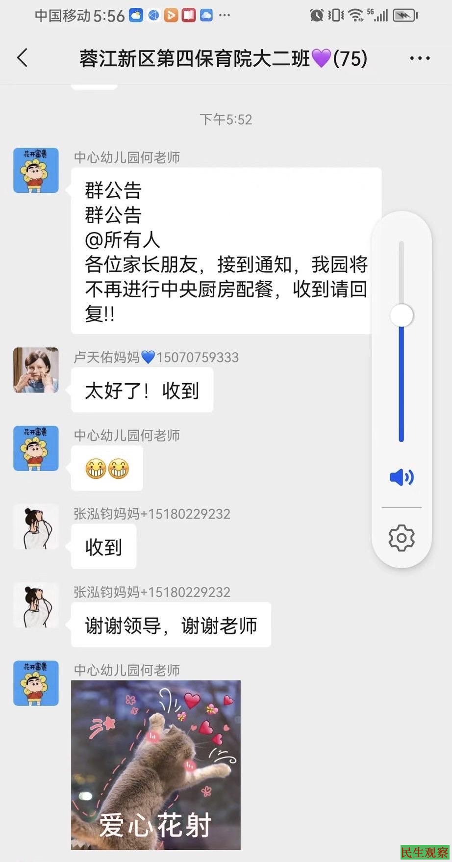 据家长提供的微信截图显示,蓉江新区第四保育院大二班何老师通知群里所有家长,称接到通知,幼儿园将不再进行中央厨房配餐,收到请回复!