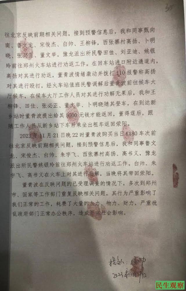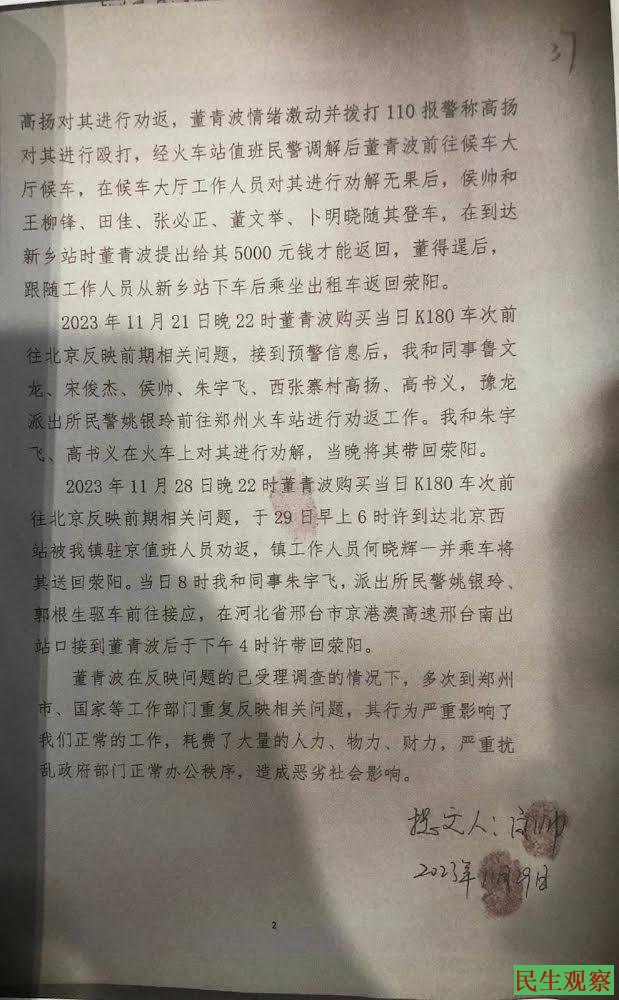 2023年11月28日晚22时董青波购买当日K180车次前北京反映前期相关问题,于29日早上6时许到达北京西,被豫龙镇驻京值班人员劝返,镇工作人员何晓辉一并乘车将其送回荥阳。当日8时白帅和同事宇飞,派出所民警姚银玲、郭根生驱车前往接应,在河北省邢台市京港澳高速出口南出站口接到董青波后于下午4时许带回荣阳。