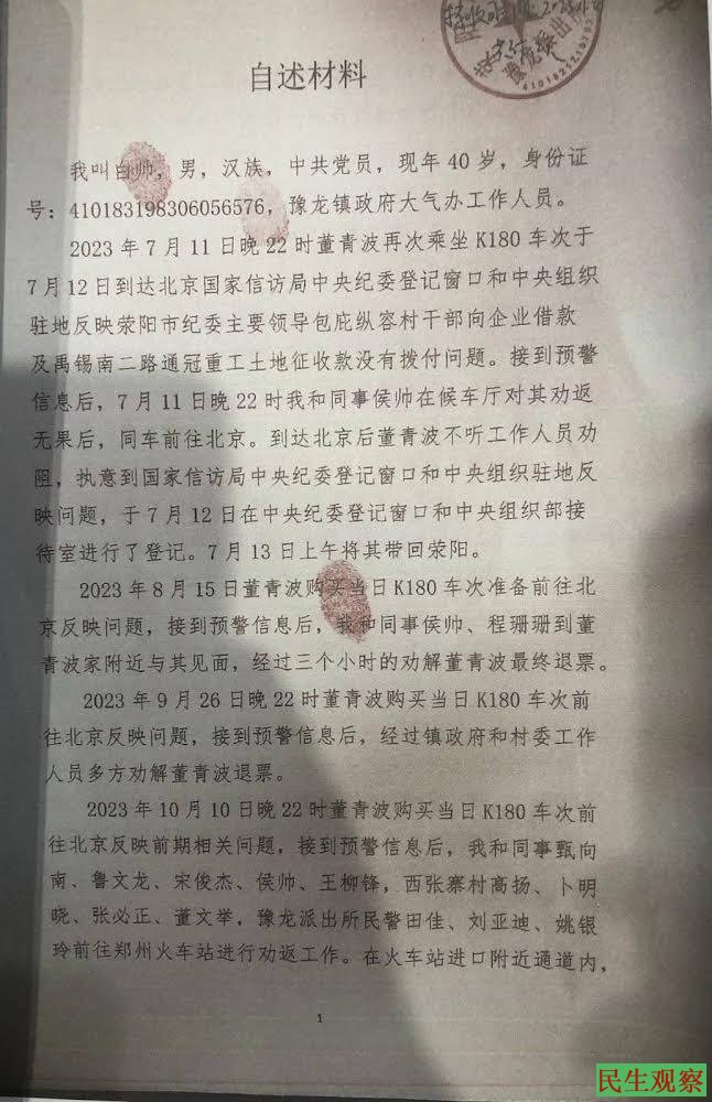 2023年11月21日晚22时董青波购买当日K180车次前往北京反映前期相关问题,接到预警信息后,白帅和同事鲁文龙、宋俊杰、侯帅、朱字飞、西张寨村高扬、高书义,豫龙派出所民警姚银玲前往郑州火车站进行劝返工作。白帅和朱字飞、高书义在火车上对其进行劝解,当晚将其带回荣阳。
