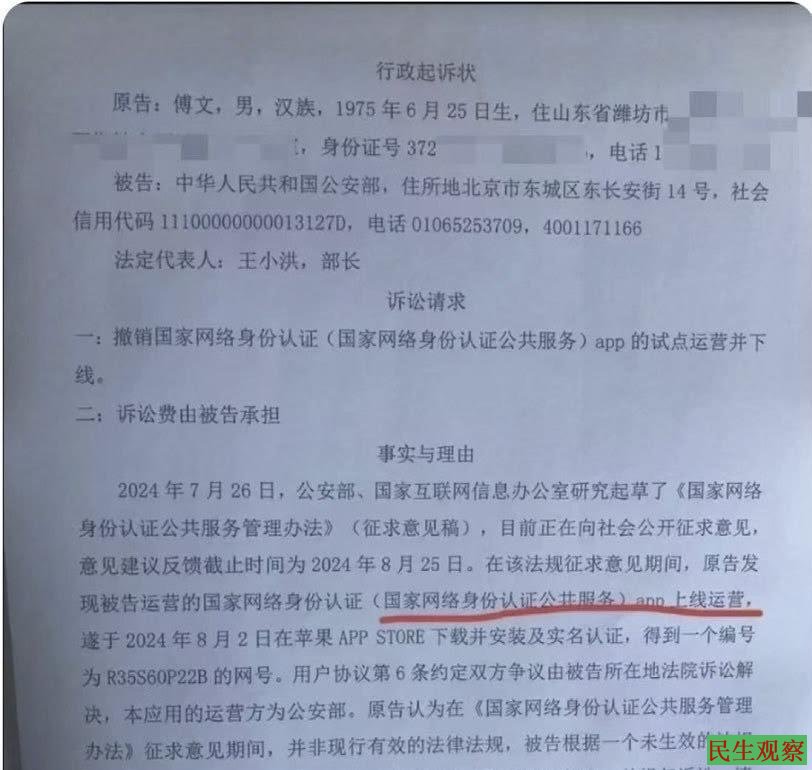 8月2日,傅文先生,就“国家网络身份认证”APP上线运营,向北京市东城区法院起诉中华人民共和国公安部。