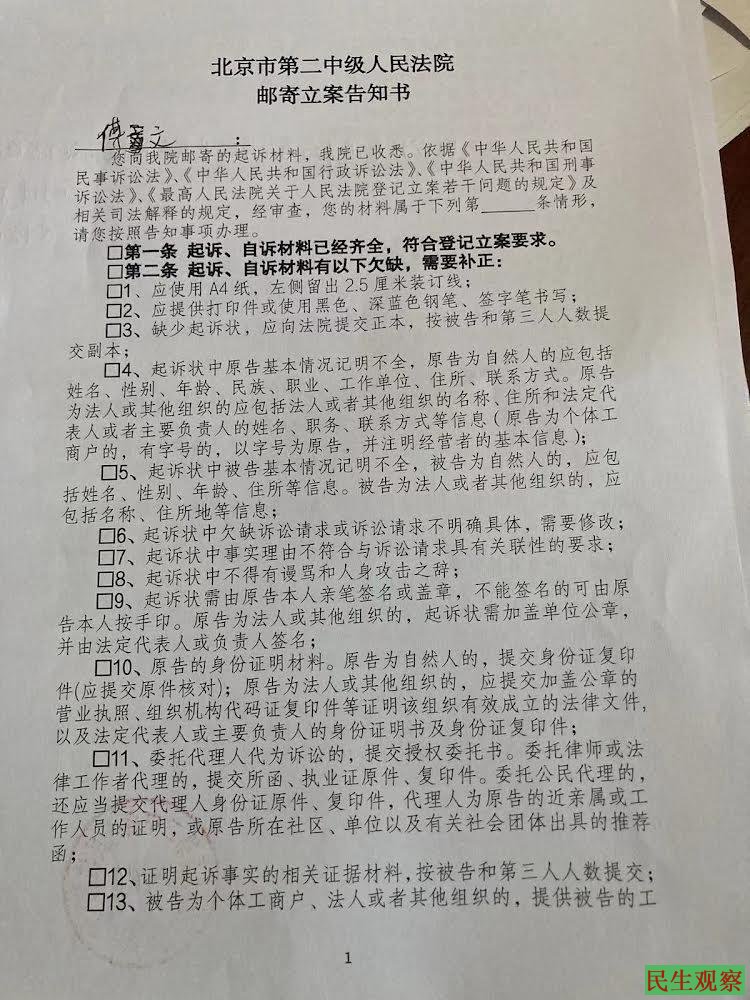 【民生观察2024年8月19日消息】日前,山东潍坊公民傅文先生因网络身份认证问题,起诉中华人民共和国公安部。近日,傅文的代理律师收到了北京市第二中级人民法院邮寄的立案告知书,对案件拒绝立案,同时要求原告傅文补正相关证据。