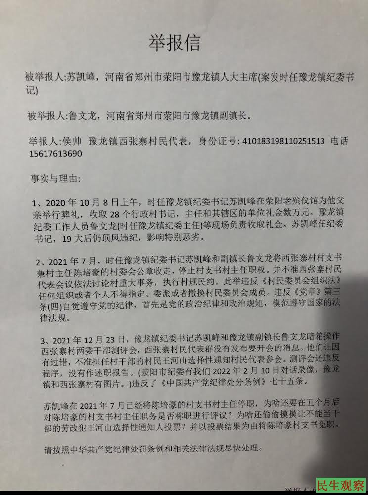 【民生观察2024年12月5日消息】近日,河南省豫龙镇西张寨村村民侯帅向郑州市中级人民法院递交了行政起诉状,请求法院判定豫龙镇政府对西张寨村村主任陈培豪的撤职行为违法。