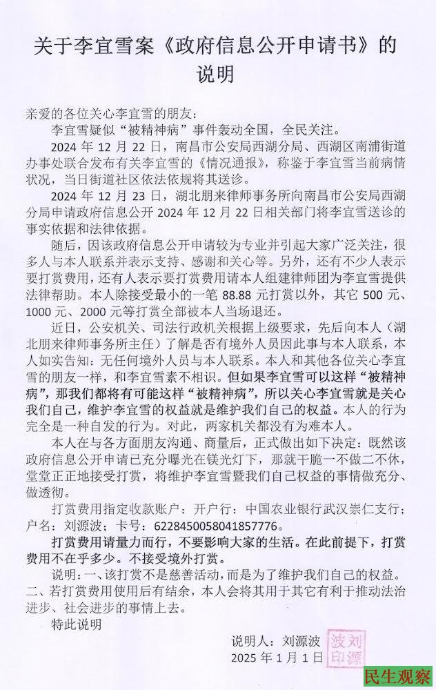 2025年1月1日,刘源波律师再度发声,对李宜雪案《政府信息公开申请书》做出了说明。