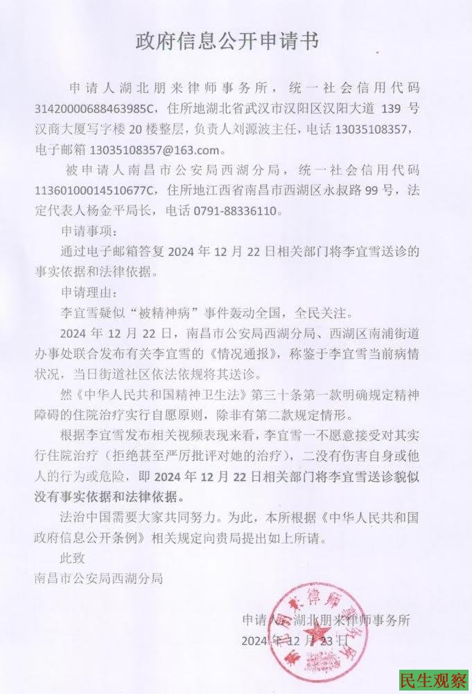 【民生观察2025年1月3日消息】江西南昌女孩李宜雪因控诉辅警猥亵,被南昌公安和街道二次送进精神病医院就诊。就李宜雪被送诊一事,湖北朋来律师事务所主任律师刘源波向南昌市公安局西湖分局申请政府信息公开,公开将李宜雪送诊的事实依据和法律依据。近日,刘源波律师再度发声,就李宜雪案《政府信息公开申请书》作出说明。