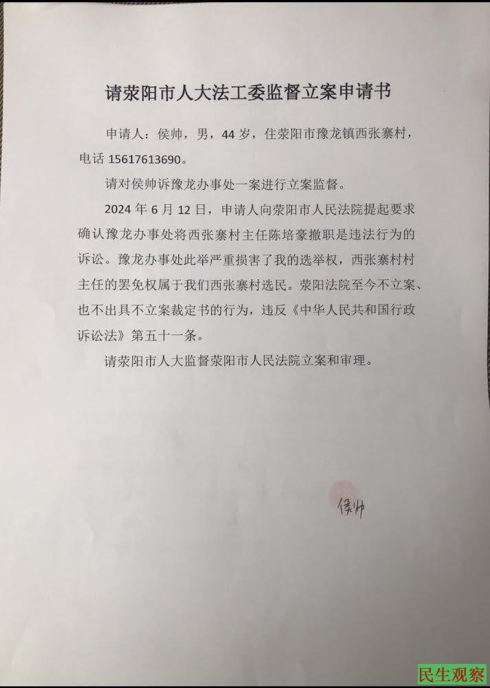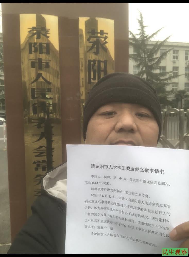 【民生观察2025年2月12日消息】近日,河南荥阳市豫龙镇西张寨村村民侯帅前往荥阳市人民代表大会常务委员会(简称:荥阳人大)提交了监督立案申请书,请求荥阳人大监督荥阳法院对其提交的诉豫龙镇政府破坏选举权一案进行立案审理。目前工作人员已受理了该案件。