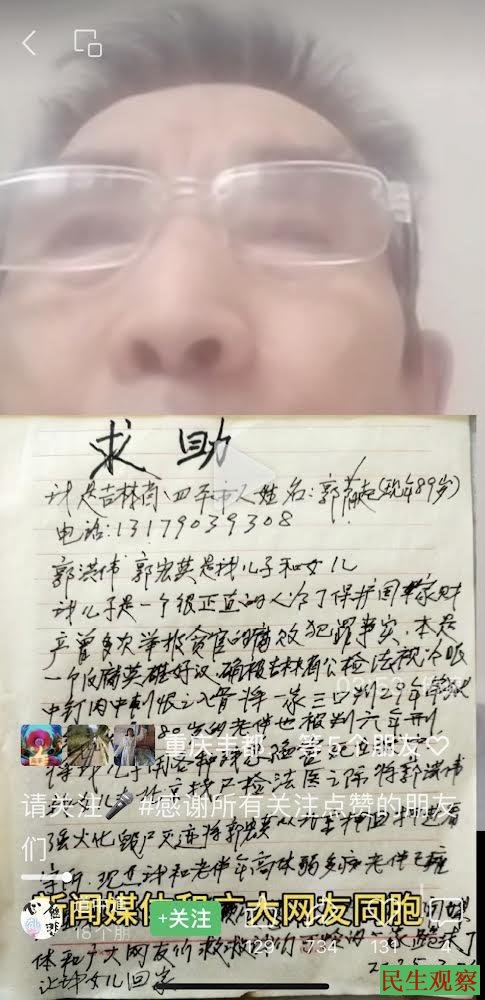 【民生观察2025年3月4日消息】吉林省四平市维权人士郭洪伟疑狱中被迫害死亡,家属质疑死因后尸体一直未火化。2024年9月23日,吉林省公主岭监狱给郭洪伟家属送达了一份《罪犯郭洪伟死亡调查结论》,并要将尸体强行火化。2024年10月中旬,郭宏英为替哥哥郭洪伟讨公道进京,随后遭到吉林当局以“寻衅滋事罪”刑事拘留,羁押在四平市看守所至今。近日,在全国两会召开之际,郭宏英的父亲郭荫起向全国人大、新闻媒体以及网友发出求助,请求帮忙释放郭宏英回家。