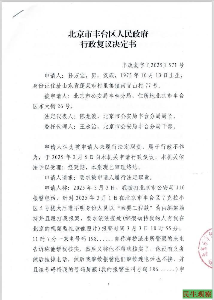过后孙万宝向北京市公安局110报警,因事发地是北京市丰台区七克拉小区,派出所参与了对孙的绑架劫持行为,派出所说他们去1502找过孙,可是孙报警后根本没人管,于是孙万宝申请了行政复议。