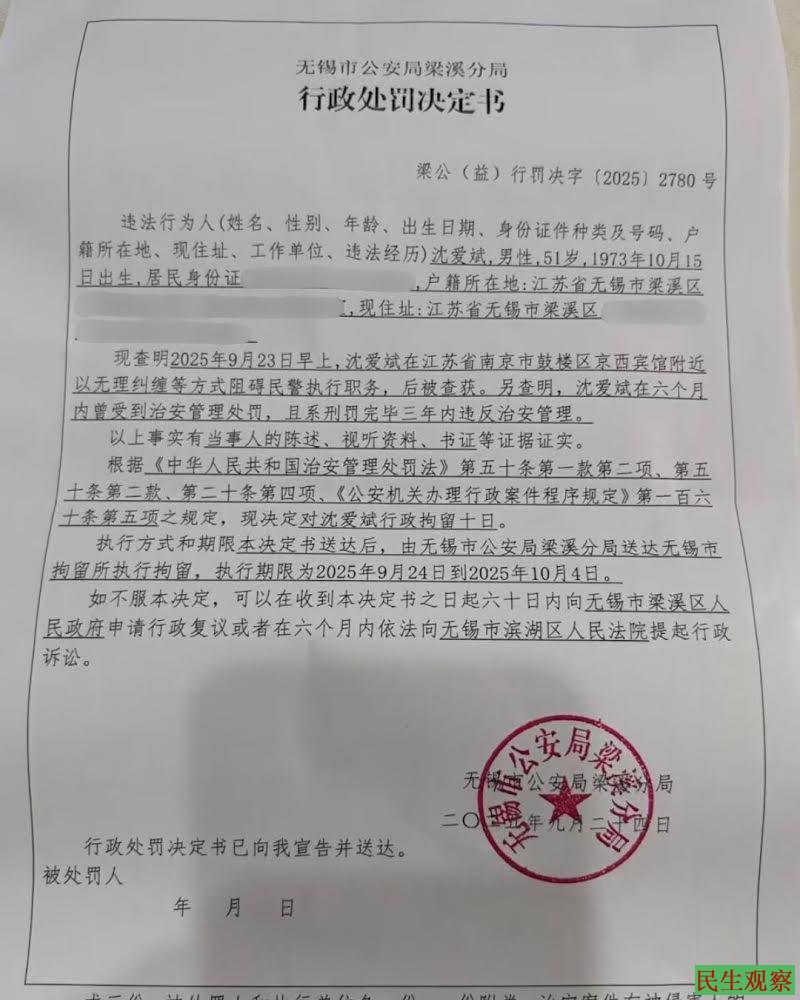 在9月24日,沈爱斌被无锡市公安局梁溪分局以“有违反治安管理的行为”处于行政拘留10天。执行期限为2025年9月24日到2025年10月4日。