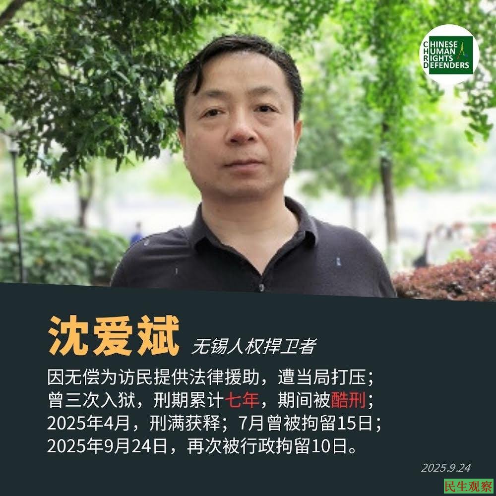 因无偿为访民提供法律援助,沈爱斌遭当局打压;曾三次入狱,刑期累计七年,期间被酷刑;2025年4月30日出狱后,他仍持续受到当局的压制。
