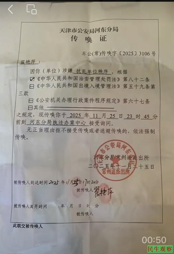 根据传唤通知书显示,翟艳萍分别于2025年11月5日、11月25日,被天津市公安局河东分局常州道派出所,以其涉嫌扰乱公共场所秩序为由进行传唤。