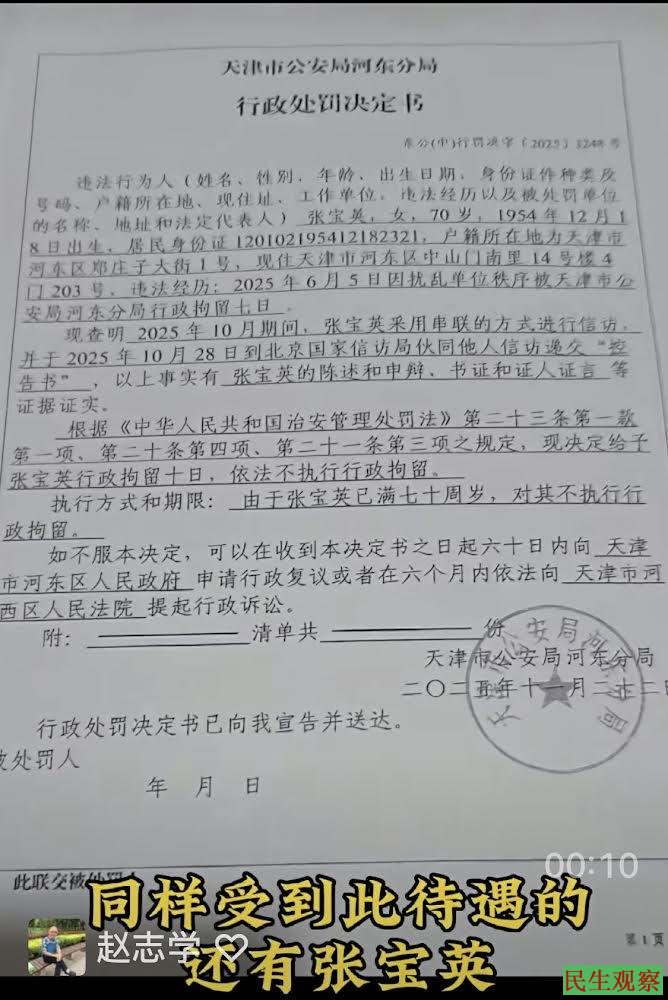 另外,同样受到此待遇的还有张宝英。张宝英因于2025年10月28日前往北京国家信访局上访,回到天津以后被天津市公安局河东分局处于行政拘留10日,因其年满70岁,遂决定不执行行政拘留。
