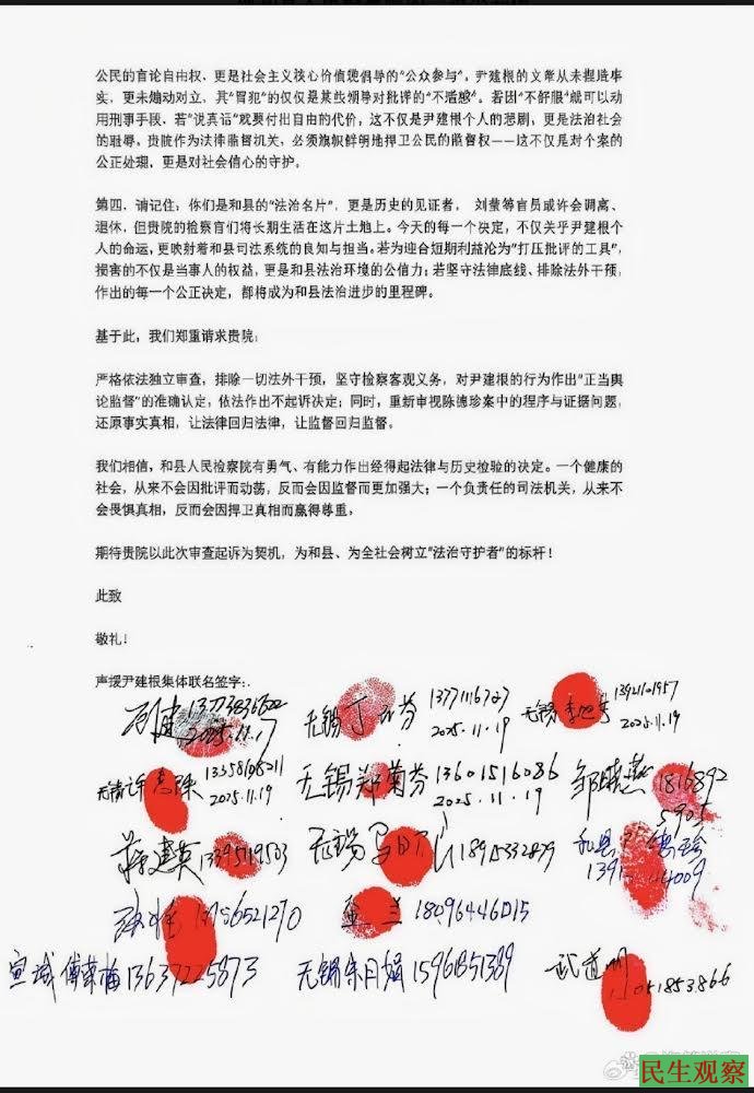 基于此,数十名关注该案的网友发起集体联名签字声援尹建根,并郑重请求贵院,严格依法独立审查,排除一切法外干预,坚守检察客观义务,对尹建根的行为作出“正当舆论监督”的准确认定,依法作出不起诉决定:同时,重新审视陈德珍案中的程序与证据问题,还原事实真相,让法律回归法律,让监督回归监督。