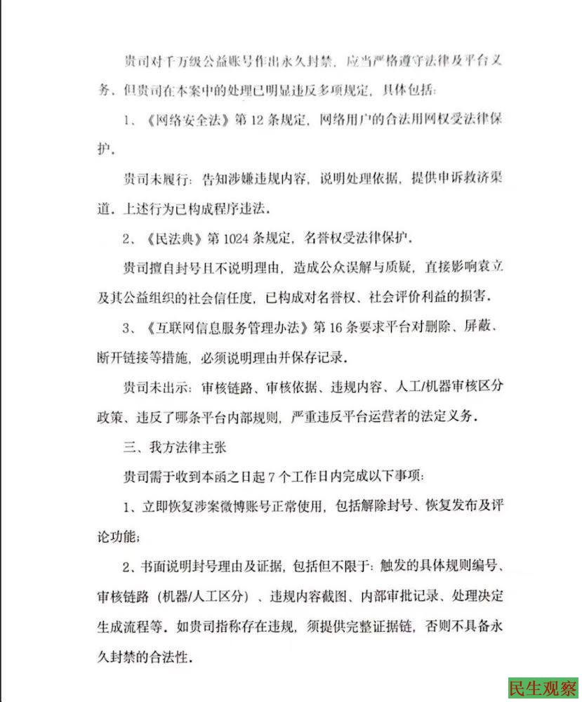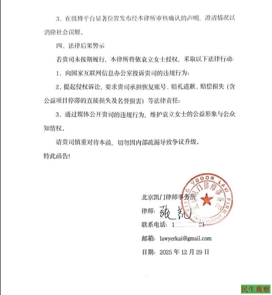 【民生观察2026年1月1日消息】2020年3月,演员袁立拥有1469万粉丝的新浪微博被无预警永封,导致其长期运营的尘肺病农民工救助项目公示中断,后续造成公众对其的误解与质疑,对袁立名誉造成侵权行为。北京凯门律师事务所张凯律师接受袁立委托,于近日致函新浪微博,严正抗议其账号被非法永久封禁。
