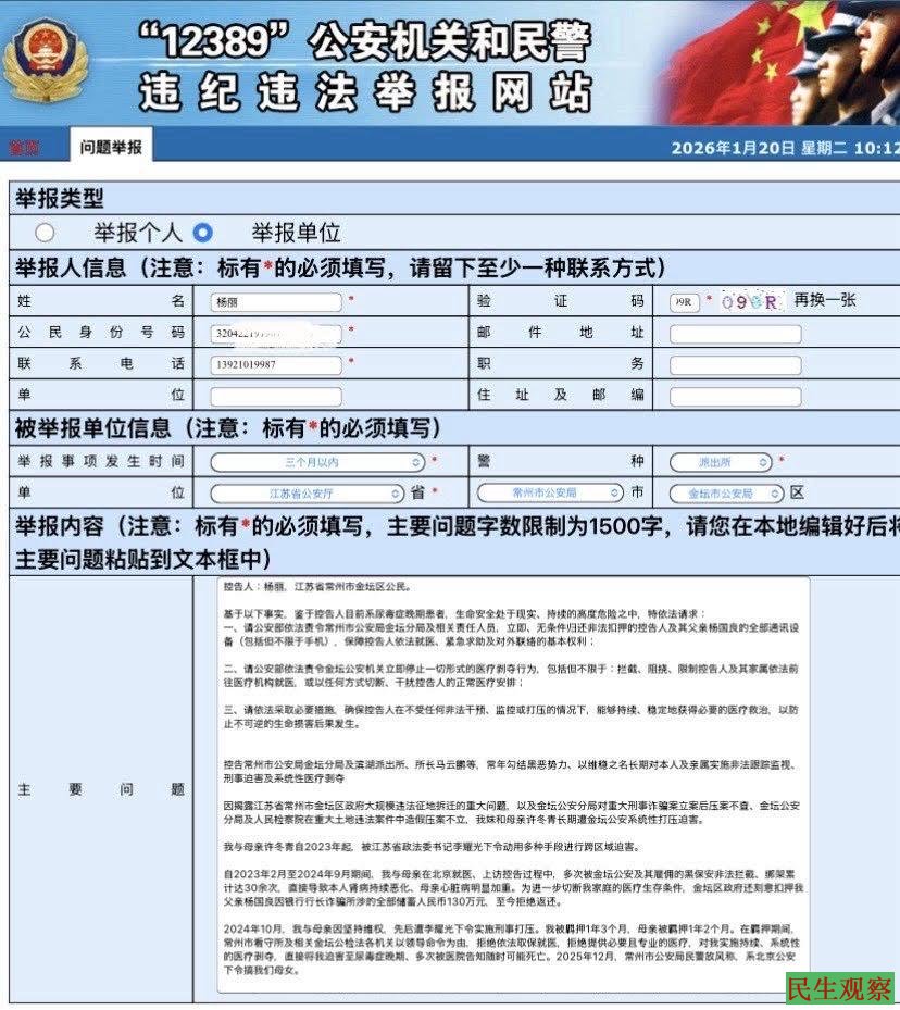 【民生观察2026年1月21日消息】鉴于江苏常州金坛公安持续、任意剥夺江苏省常州市金坛区公民杨丽的就医权利,近日其姐杨彩英(现居日本)已代之向公安部提出控告。杨彩英表示,若杨丽就医权利在近期仍无法实现,她将公开呼吁公安部部长王小洪引咎辞职。