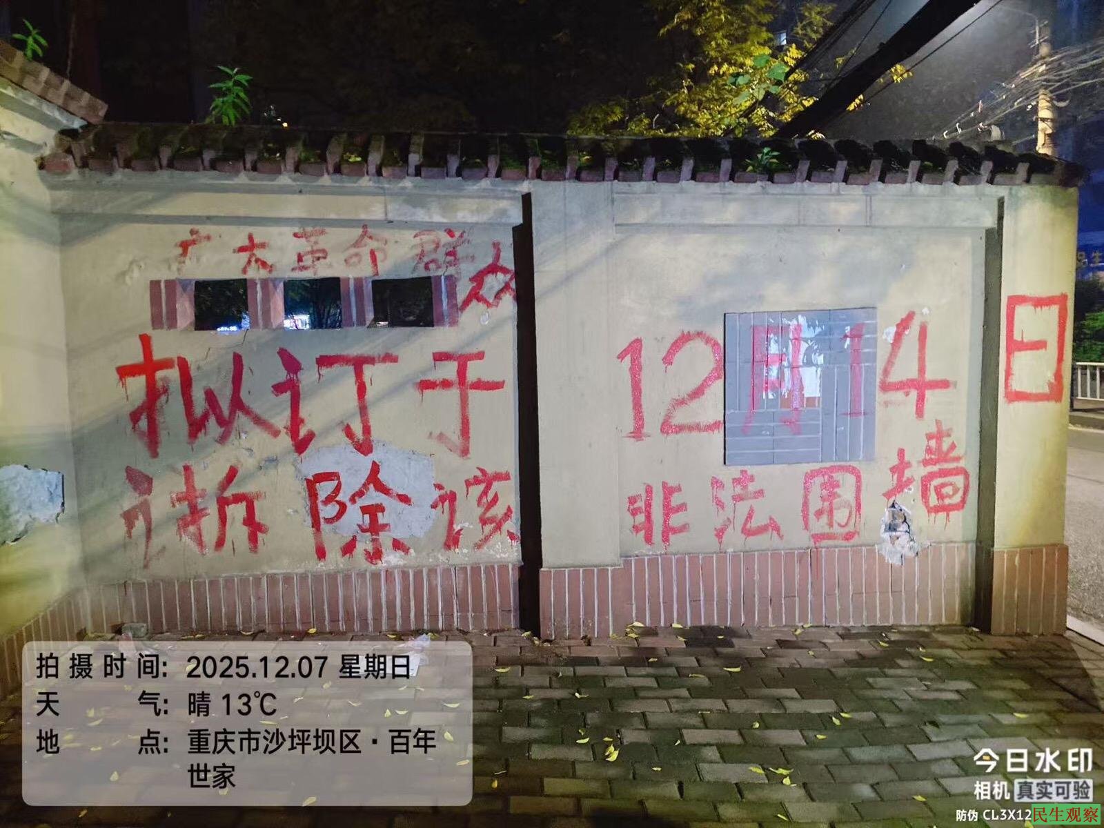 事情的起因很简单:重庆大学旁的一段围墙多年来一直占据人行道,行人只能在公路上行走,人车混行,险象环生。在多方反映无果的情况下,我们在围墙上写下“拆除围墙”的大字,我们只是为了自己的权益,希望围墙尽快拆除,并没有损害国家的、社会的、集体的利益和其他公民的合法的自由和权利。但是,沙坪坝派出所却动用了国家公权力来打压我们。他们以“传唤”为名,行“抓捕”之实!在没有任何确凿证据、没有任何违法事实的情况下,强行将我们带进行“办案中心”,双手被戴上手铐,身上物品被收空,手机拿去提取信息,个人的生物体征等敏感信息全部被提取,包括身高体重正身照侧身照,指纹,掌纹,声音以及双眼的虹膜。然后在双手双脚被强制固定的金属椅上接受审讯,最后被关进办案中心里面一间5、6平方的小房间里,一只手被带上镣铐,而镣铐的另一端则铐在一根手臂粗的钢管上,虽然房间顶上有空调的热风,但对已进入大雪季节且只能躺在冰冷水泥地上过夜的人来说何偿不是一种身体的折磨,尤其对于我们三个60来岁左右的年龄来讲。这就是典型的滥用职权,是公权力对私权利的野蛮碾压!