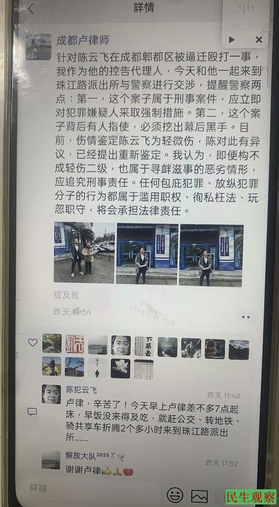 【民生观察2026年2月11日消息】近日,陈云飞与其控告代理人卢思位律师,针对自己被逼迁殴打一事,到珠江路派出所与警察进行交涉。陈云飞对鉴定为轻微伤提出异议,已提出重新鉴定申请。