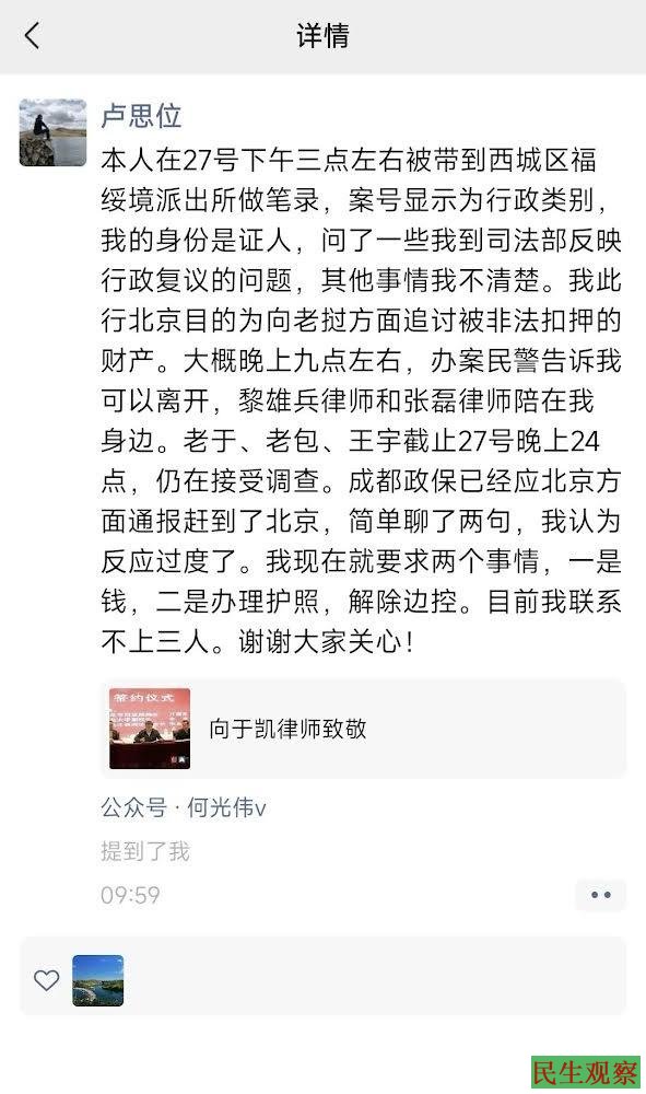 另外,卢思位律师当时被强行带到北京市公安局福绥境派出所,做了一个笔录,大概27日晚上8:00后做完了,做完笔录也不让离开,后来才让卢思位律师离开。