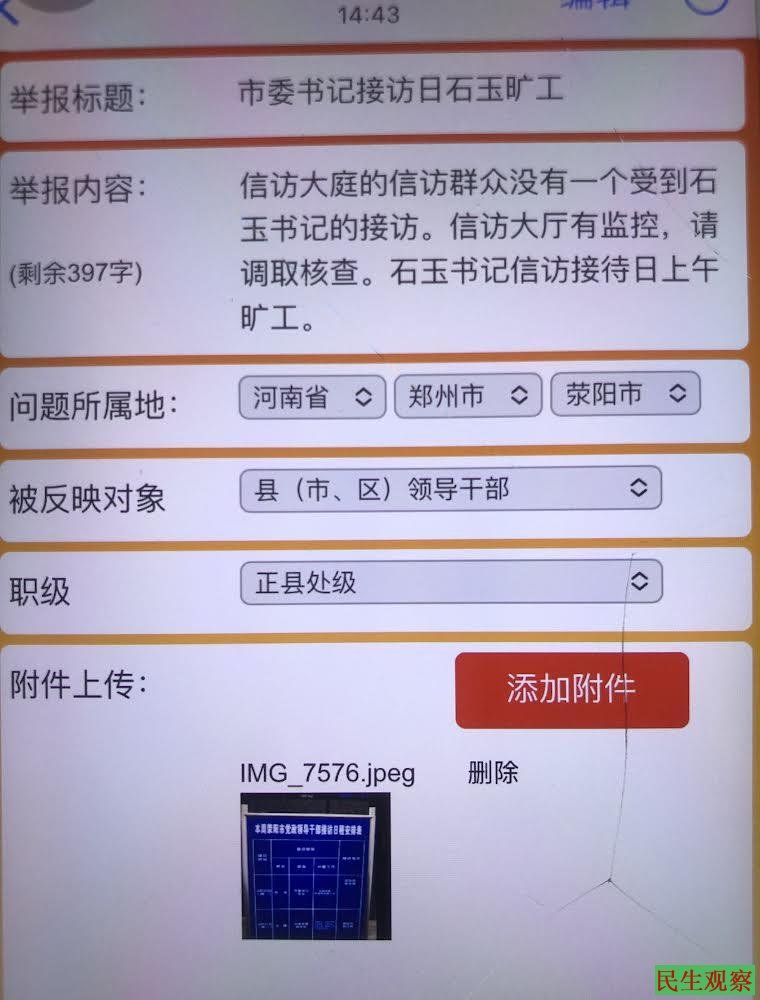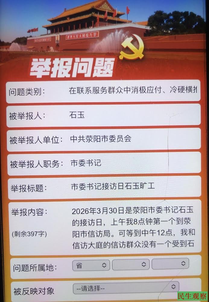 【民生观察2026年4月1日消息】近日,河南荥阳维权人士侯帅前往信访局,递交材料反映河南荥阳豫龙镇原党委书记张佳涛等5人,滥用职权、破坏选举、贪污腐败,打击报复举报群众等违法乱纪问题。随后,侯帅接到当地派出所电话,要求他删除在微博上发的反映问题的帖子。