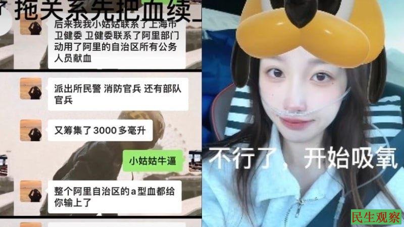作者小鱼儿sunny丫在其网易自媒体“网易号”上发表文章《“血槽姐”最该对给了她二次生命的献血者说一句:谢谢侬!》,文章说,血槽姐视频炫耀满屏都是刺眼的四个字:特权,有钱。如果没有动用特权,没有通过上海卫建委这层关系,你能联系到千里之外的阿里地区。如果没有利用特权,在地广人稀的阿里地区,你能发动那么多公务员进行献血。至于包机这个事,说明血槽姐家境殷实,付得起包机费和昂贵的医疗费。普通百姓,你包个机试试。明明是阿里全员动员献血,事后却洗地说人家是自愿献血行为,吃相真难看。